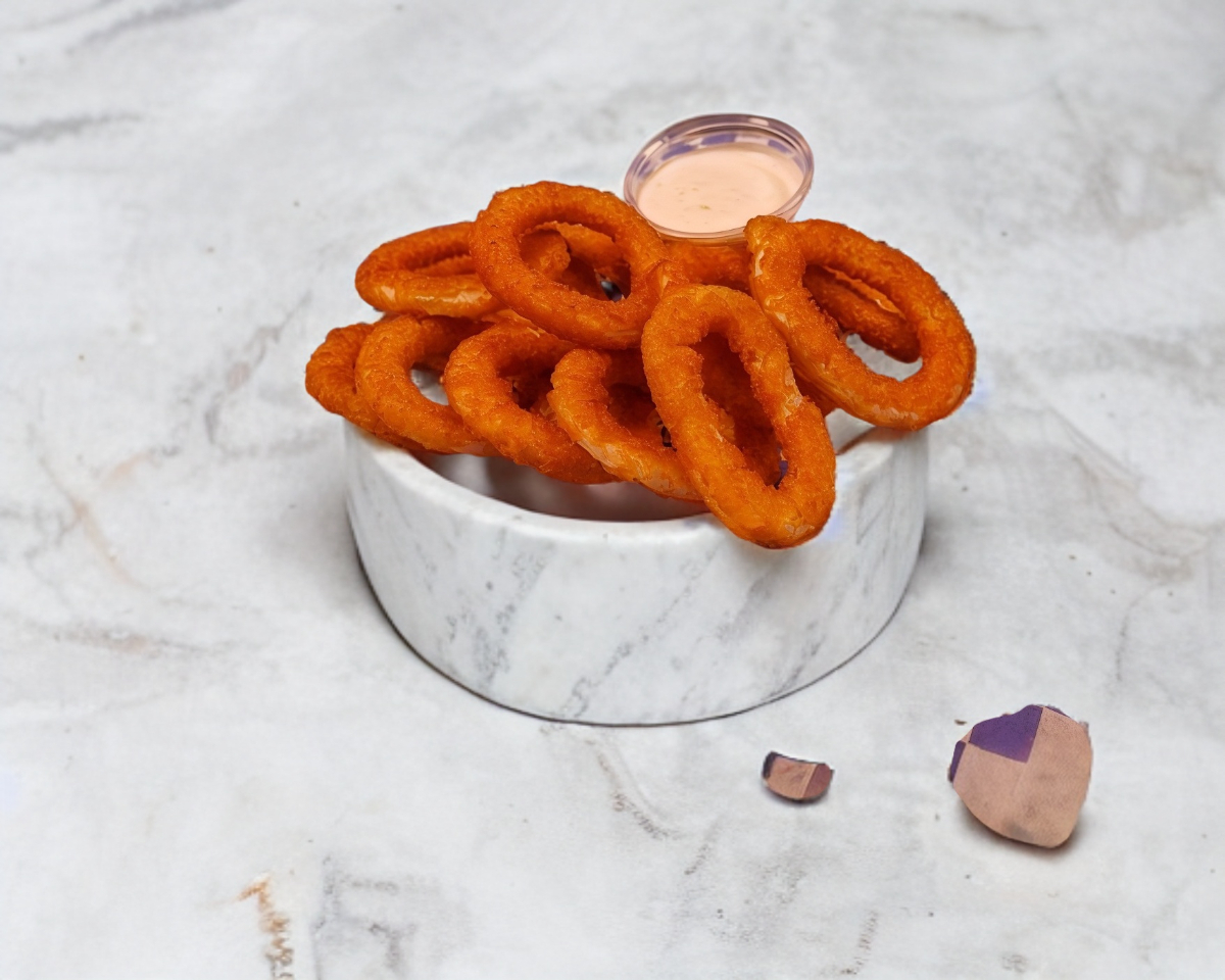Crujientes Aros de cebolla acompañados de cremoso dip ranch