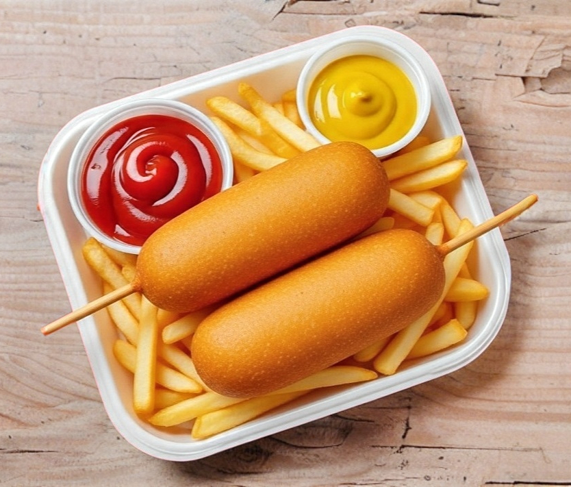 1 Pipos clásicos con salchicha de pollo y puerco, acompañado de 2 aderezos a elegir con papas fritas.