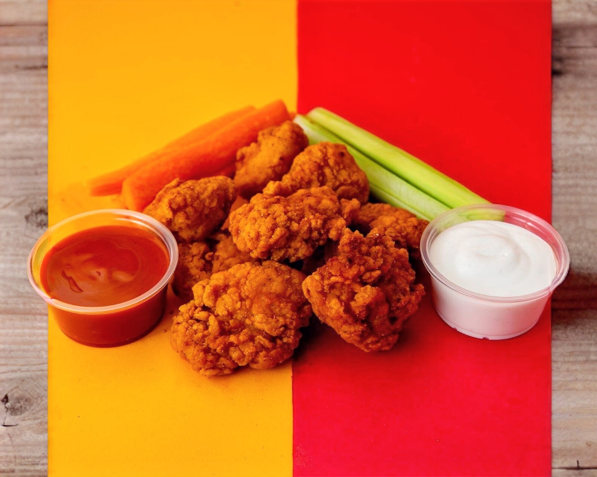 300 g De trozos de pechuga de pollo empanizado acompañado de apio y zanahoria. Incluye 1 salsa y 1 aderezo a elegir.