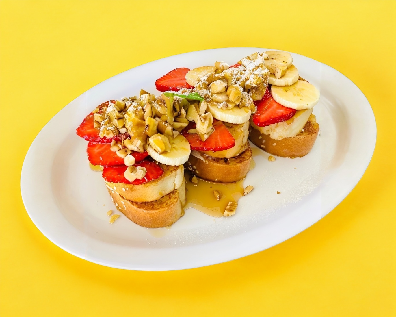 3 Piezas de pan baguette capeadas, rellenas de queso crema con un topping de fresa, plátano, nuez, bañados de miel mascada de la casa.