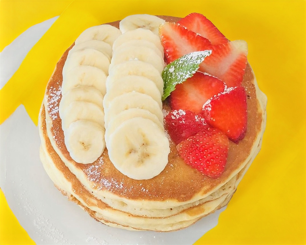 3 Pancakes natural con topping de fresa y plátano espolvoreado con azúcar glass.
