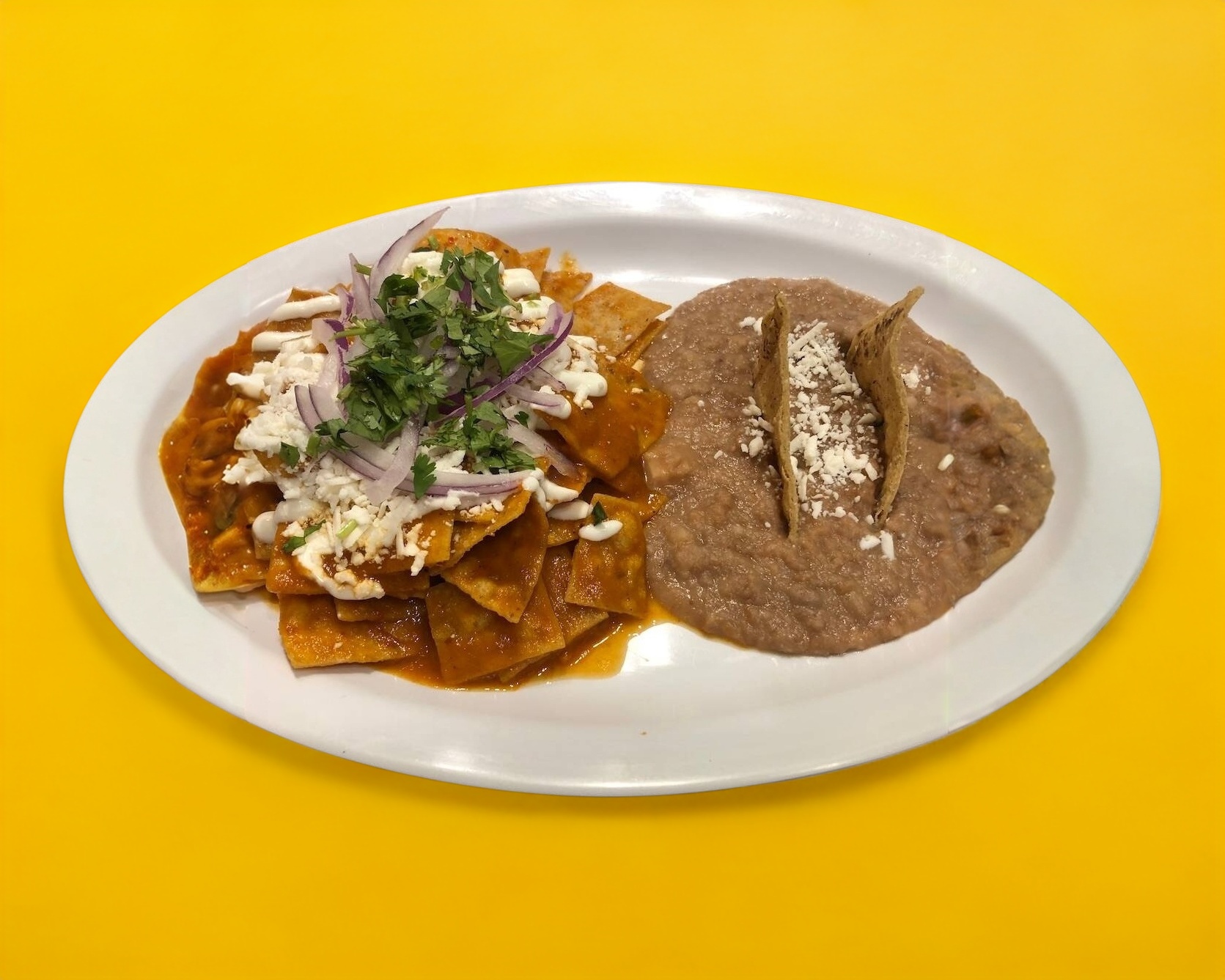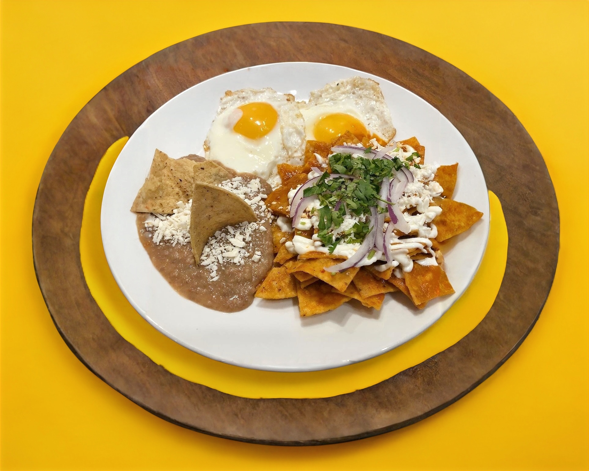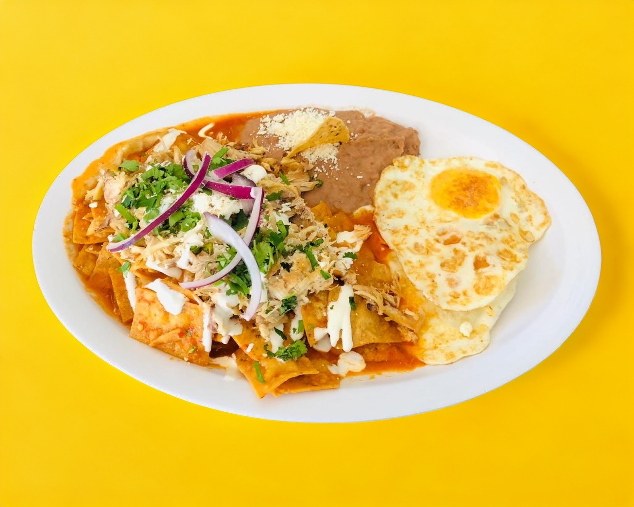 Generosa porción de chilaquiles en salsa roja o verde, acompañados de frijoles de la casa y dos huevos al gusto.