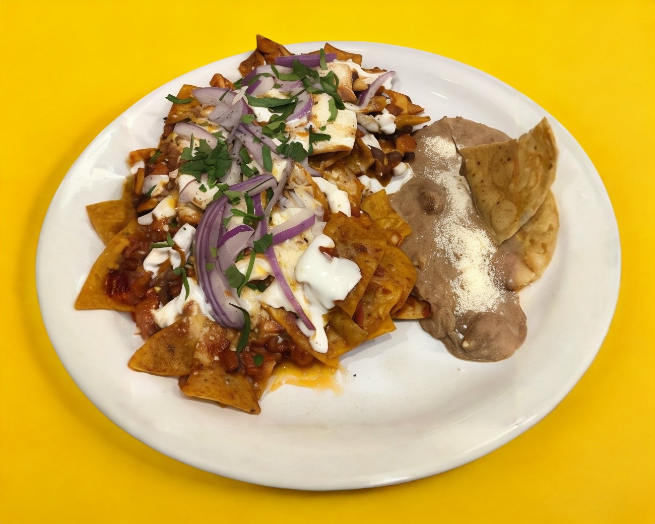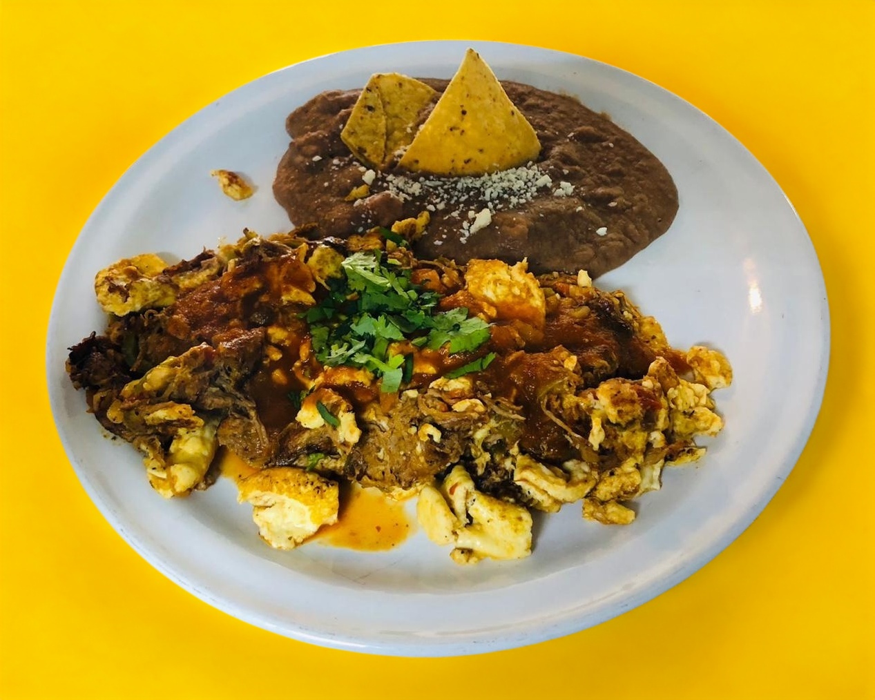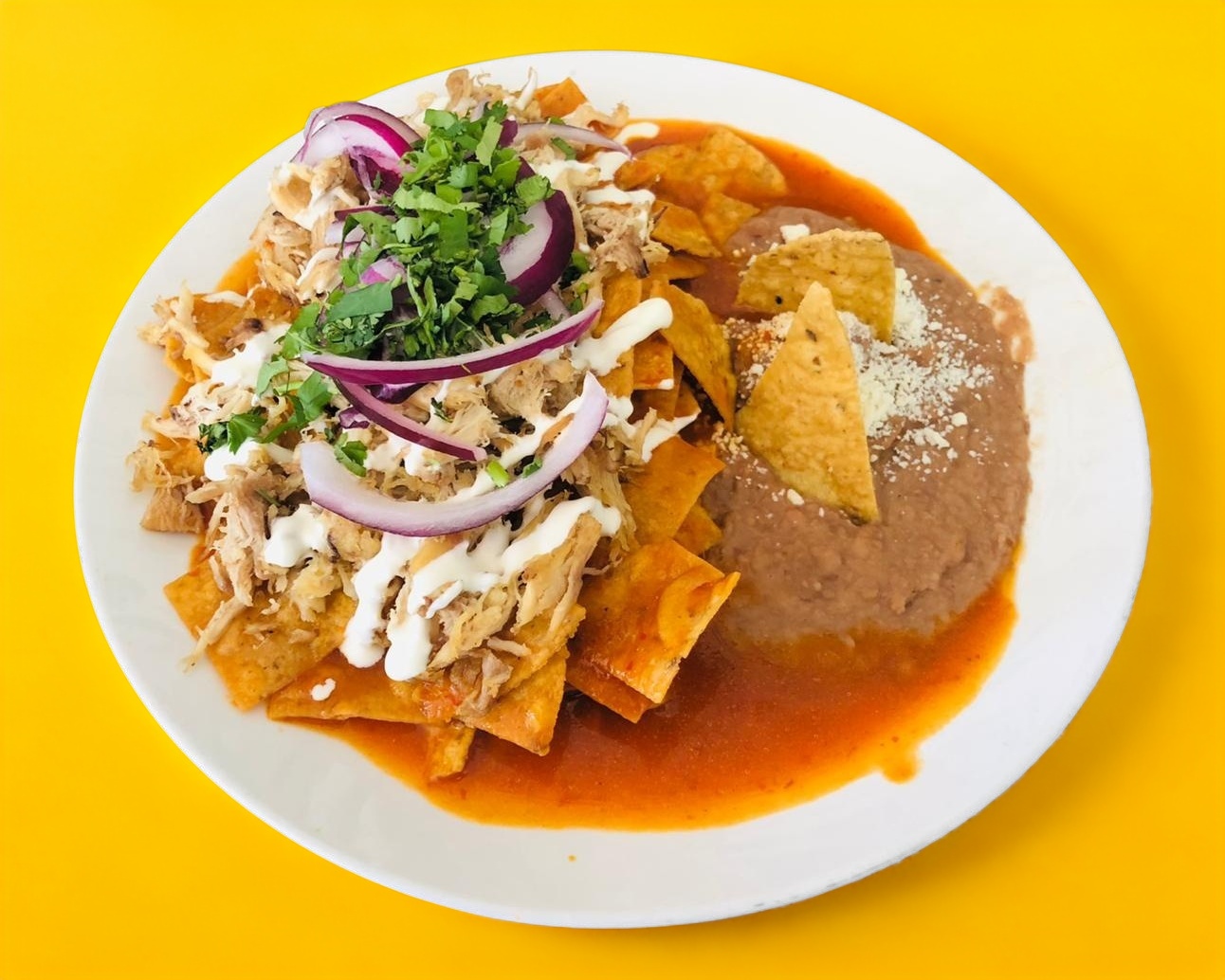 Generosa porción de chilaquiles en salsa roja o verde, acompañados de frijoles de la casa y dos huevos al gusto.
