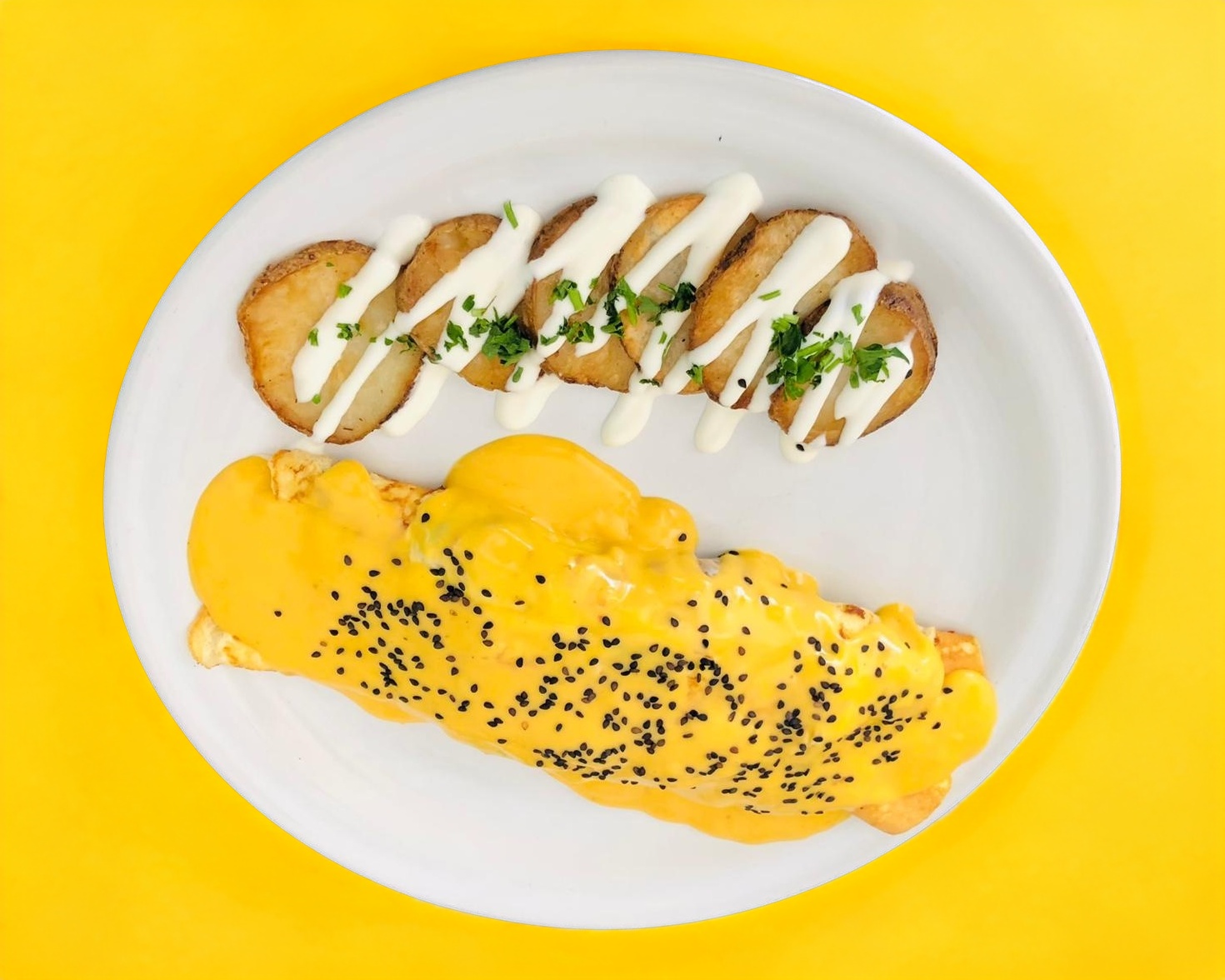 Relleno de mozzarella, huevo revuelto, espinaca, champiñones y verdura base, cubierto con un baño de salsa de elote. Acompañado de rodajas de papa.