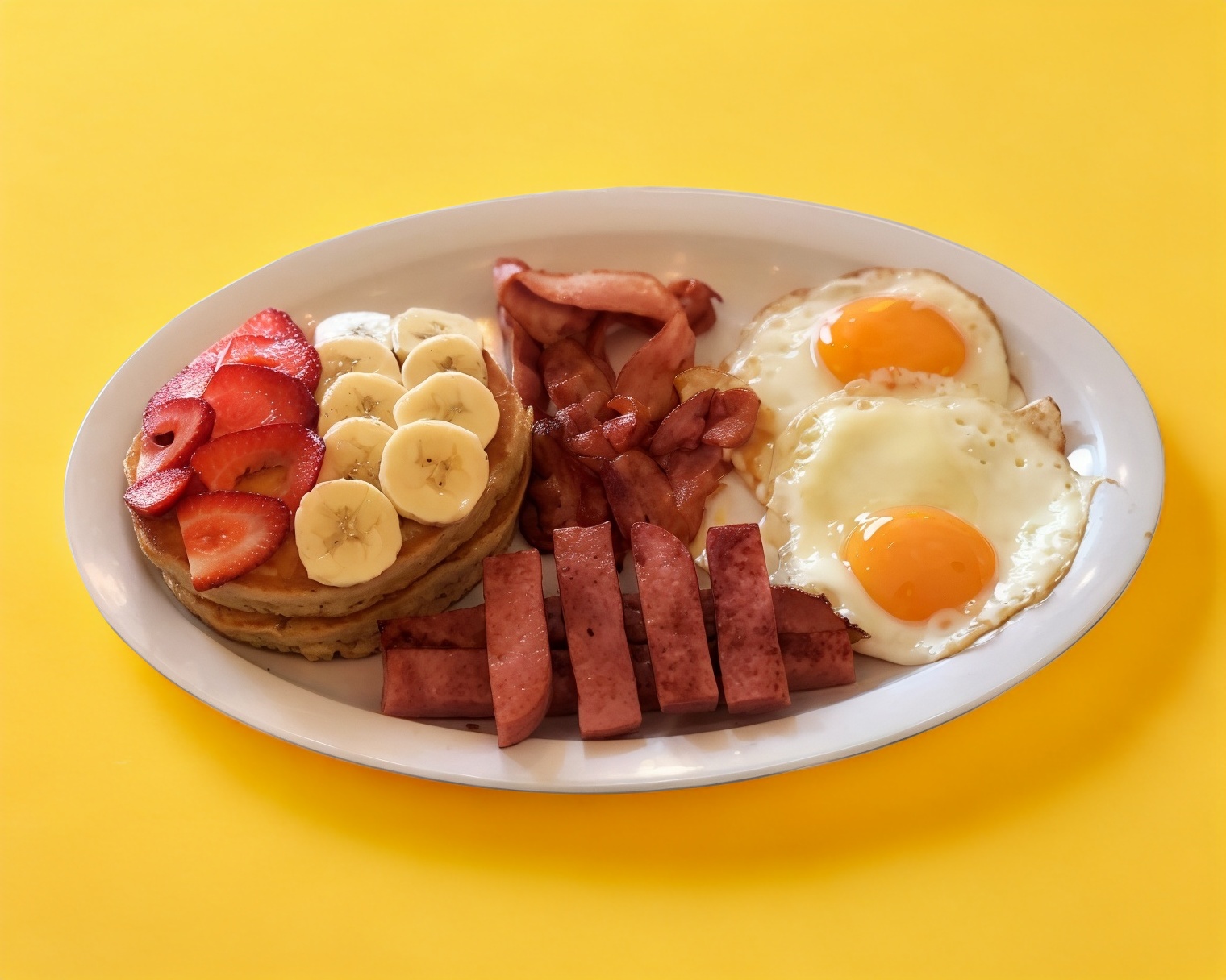 Dos pancakes con topping de fresas y plátanos espolvoreados con azúcar glass acompañados de 2 huevos al gusto y generosos trozos de jamón y tiras de tocino doraditas.