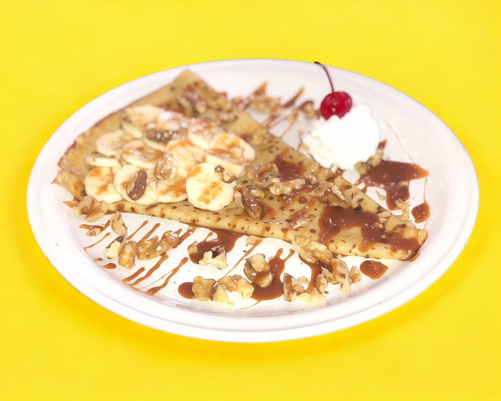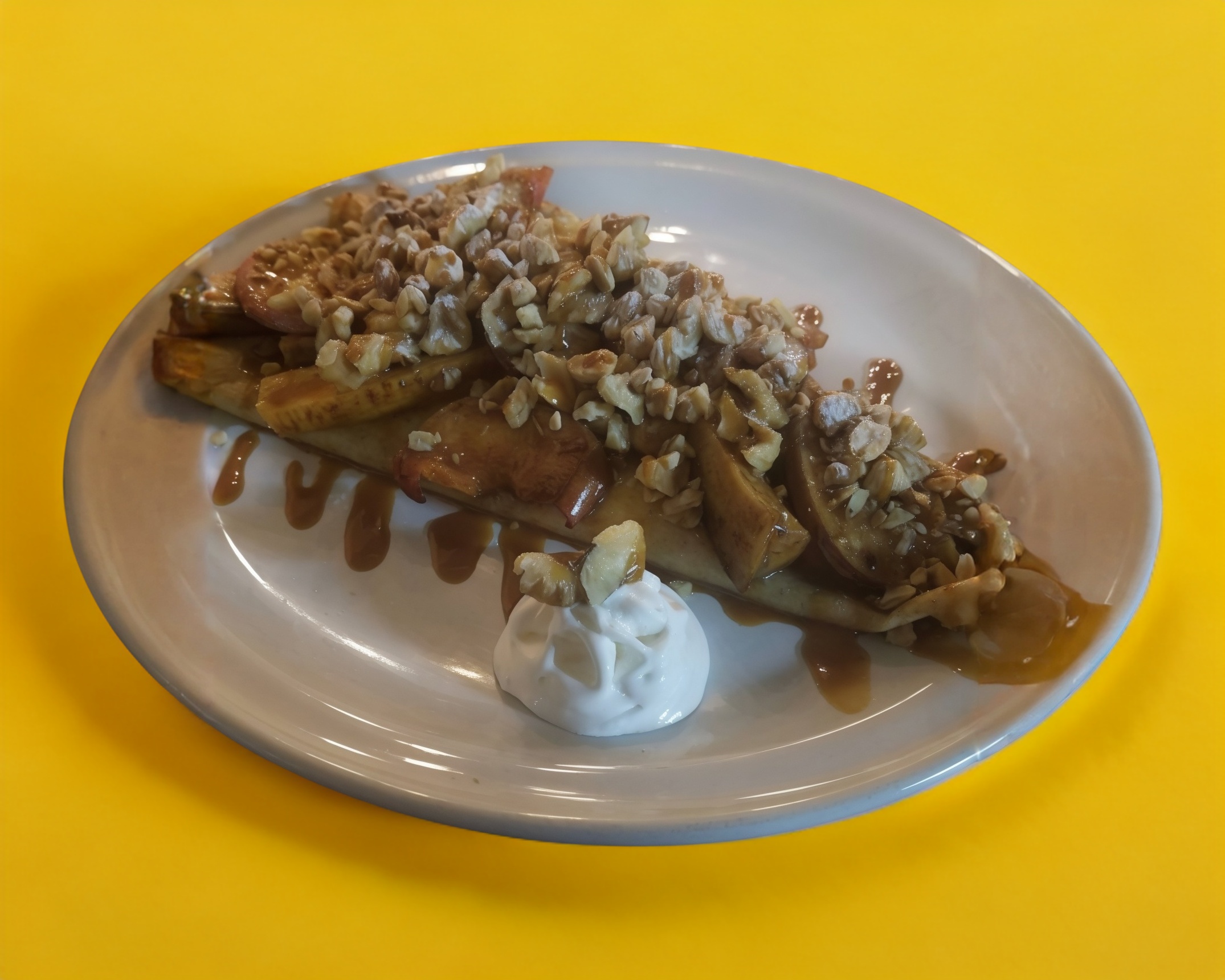 Relleno de queso crema y mermelada de fresa, plátano flameado al brandy y manzana asada, con baño de cajeta, nuez, cacahuate y azúcar glass.