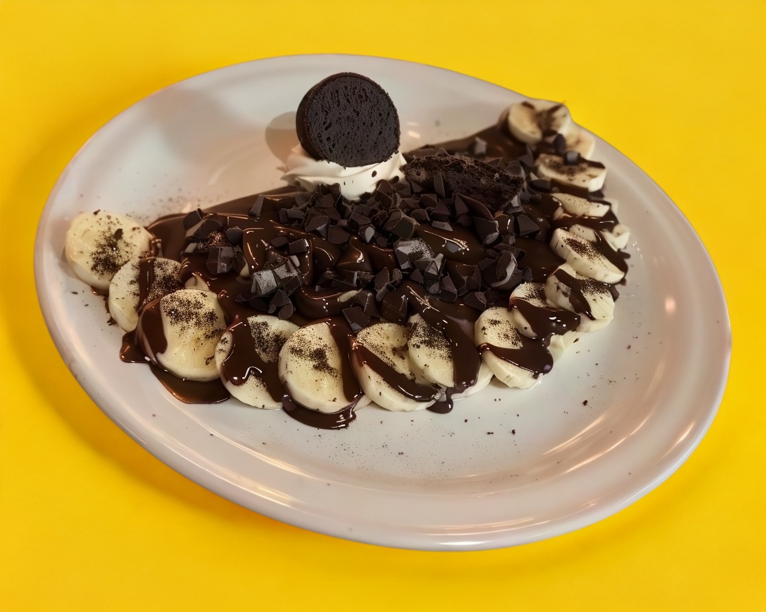 Crepa de chocolate rellena de crema de oreo, acompañada de chocolate líquido y galleta molida.