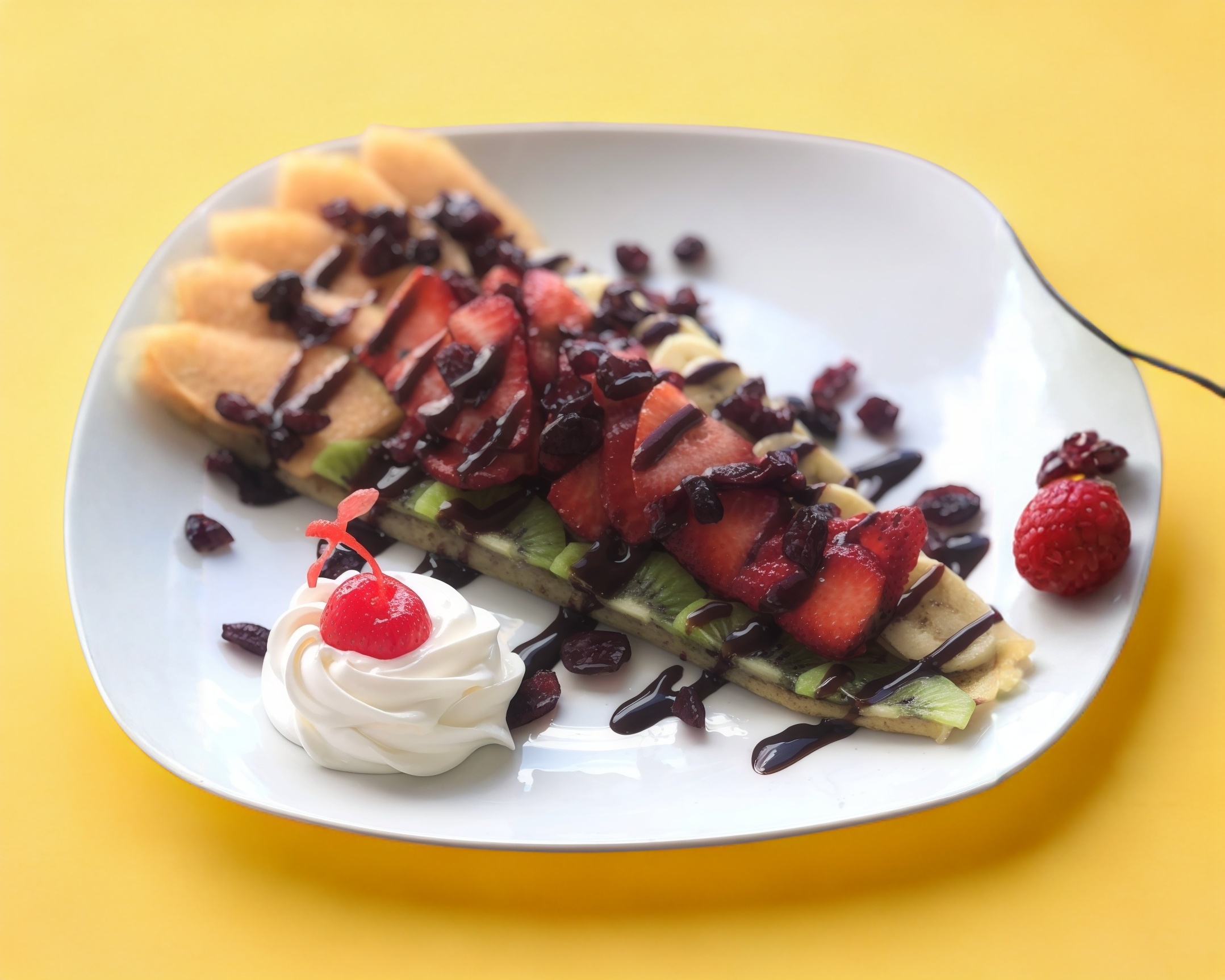 Rellena de queso crema, nutella y manzana asada al brandy. Acompañada de frutas de temporada y arándanos.