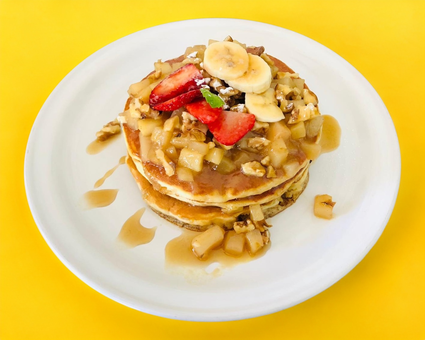 3 Pancakes con una mezcla de manzana natural canela y nuez bañados con miel mascabada de la casa con topping de fresas y plátano.