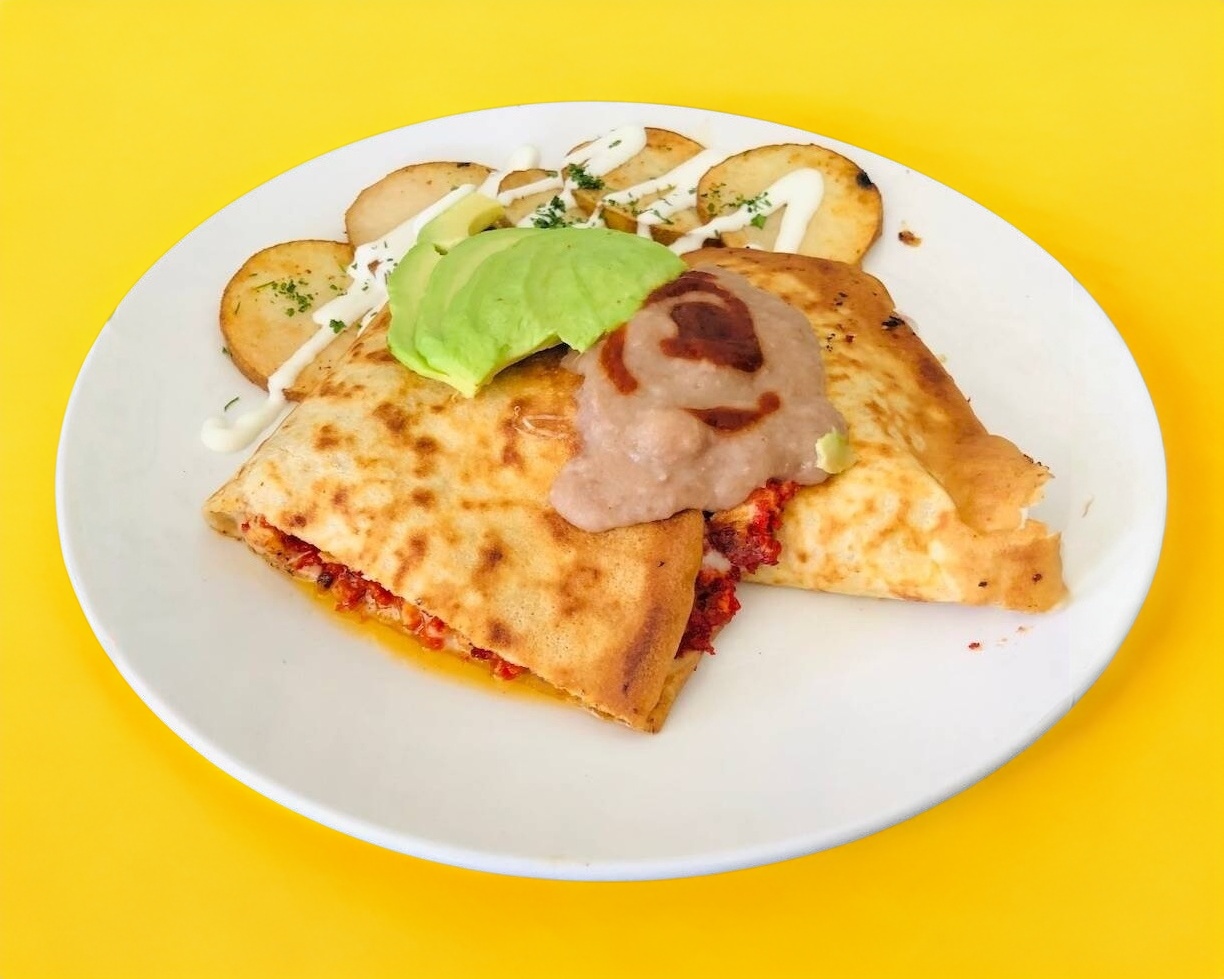 Relleno de queso mozzarella, chorizo con huevo como topping, bañada con crema de frijol con un toque de chipotle. Acompañado de rodajas de papa.