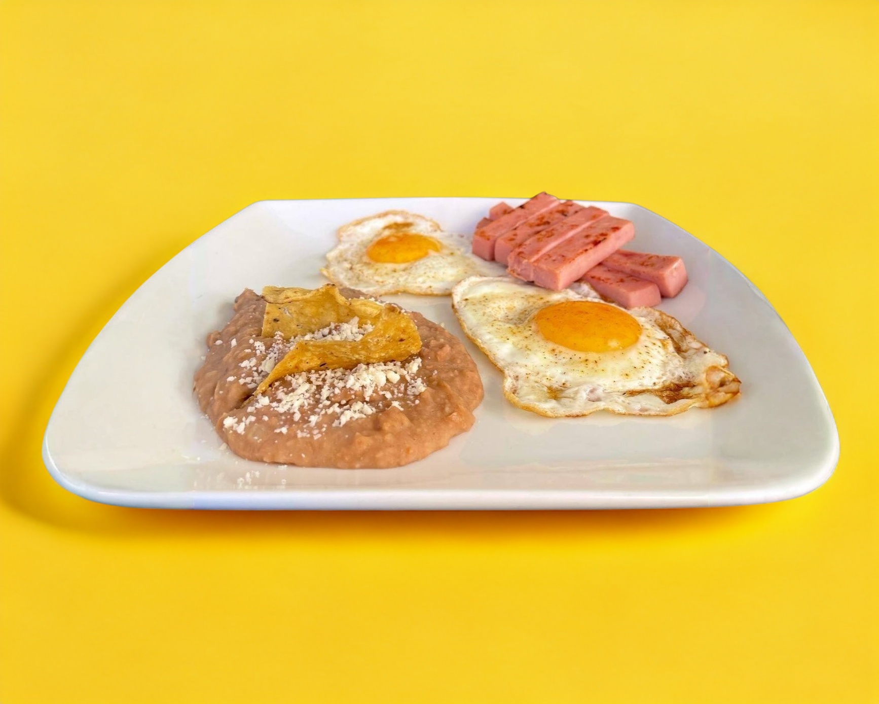 Dos huevos preparados a tu elección con un ingrediente a elegir acompañados de frijoles o ensalada verde.