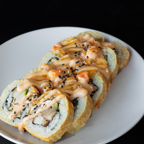 Capeado, relleno de atún spicy, queso crema, aguacate, salseado con anguila y spicy mayo.