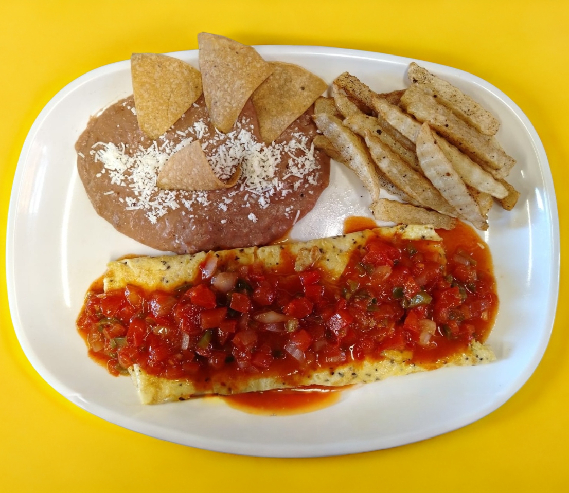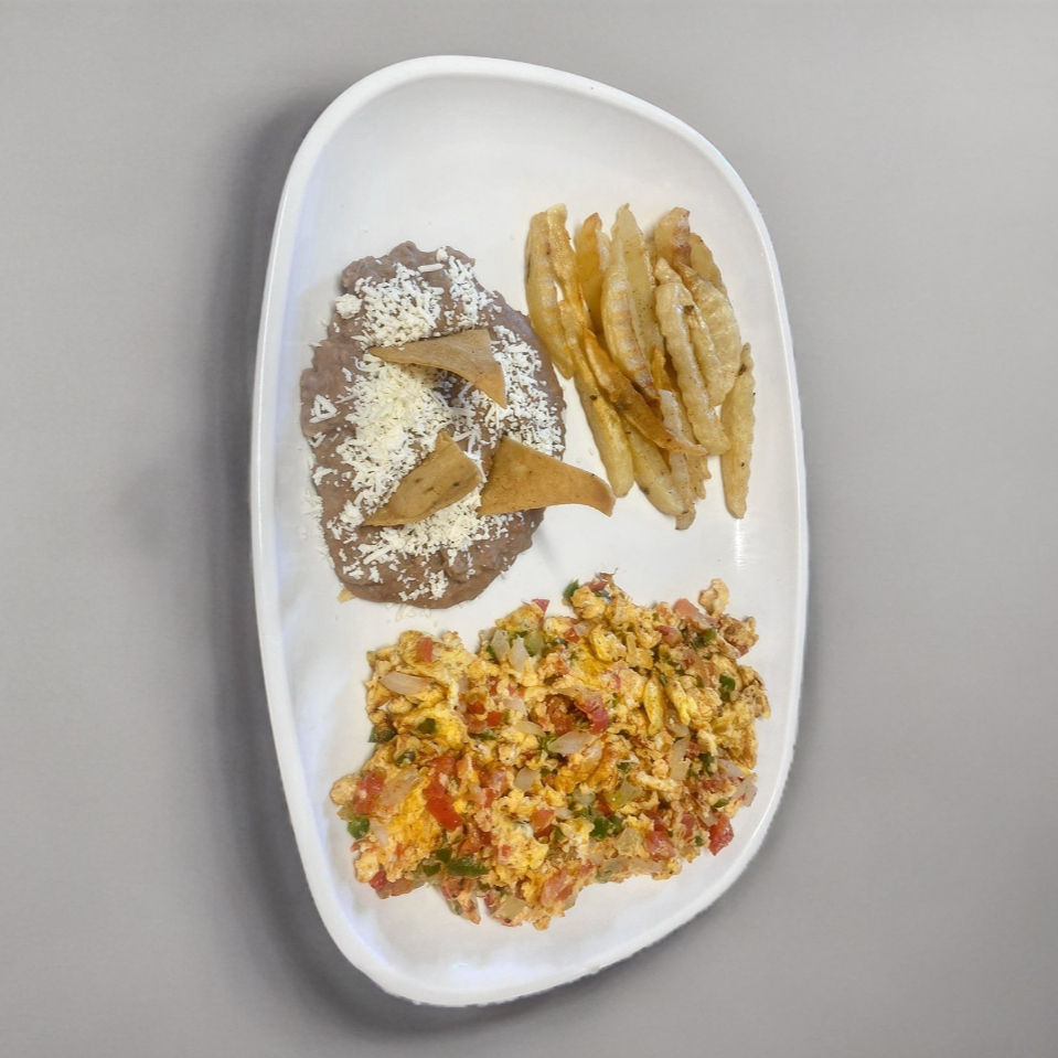 Huevo al gusto, acompañado de papas fritas, frijol y tortillas de maíz o harina.