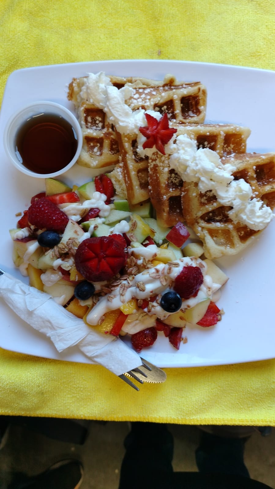 2 Piezas de waffle acompañadas con fruta de temporada o una bola de nieve a elegir.