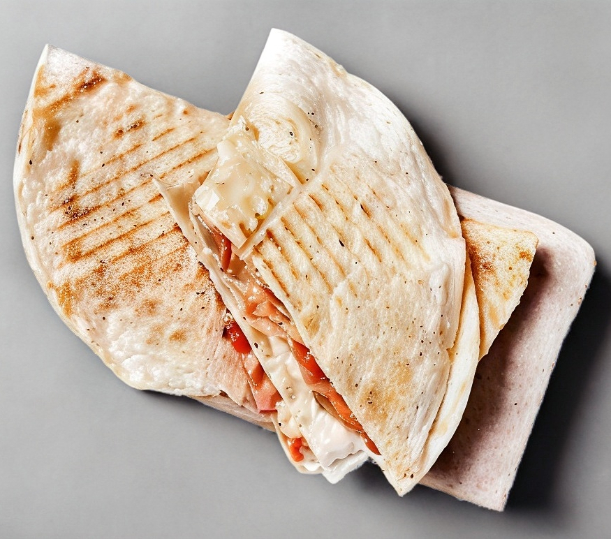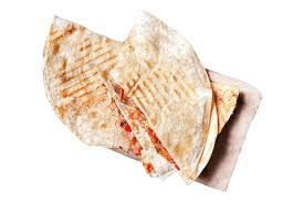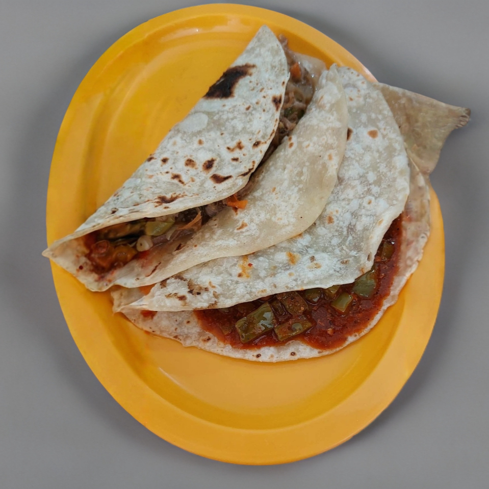 Tortilla de harina, con queso, carne asada, acompañado de frijol, ensalada y salsa bandera.