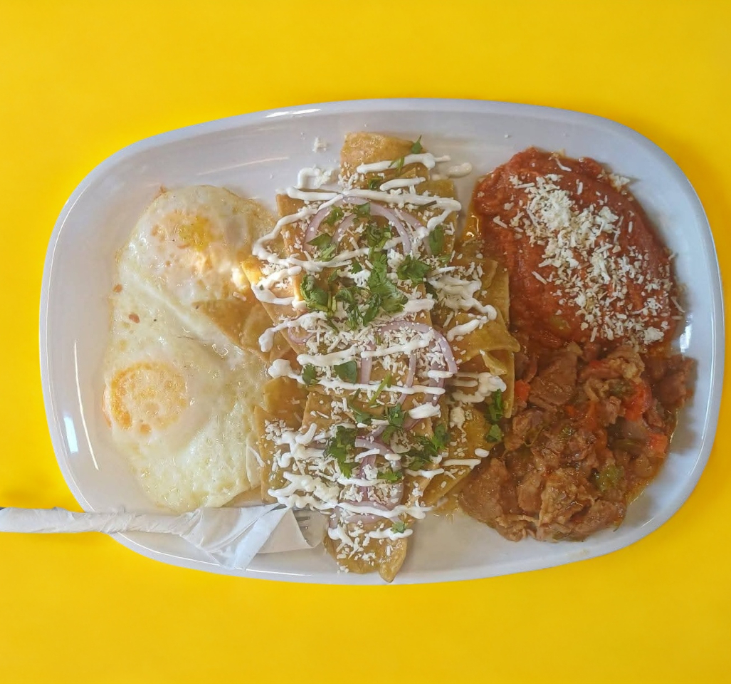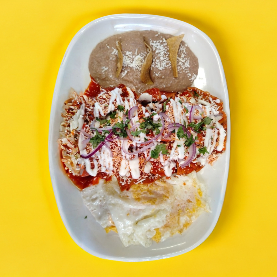 Chilaquiles verdes o rojos, huevos revueltos o estrellados y bistec ranchero y frijol.