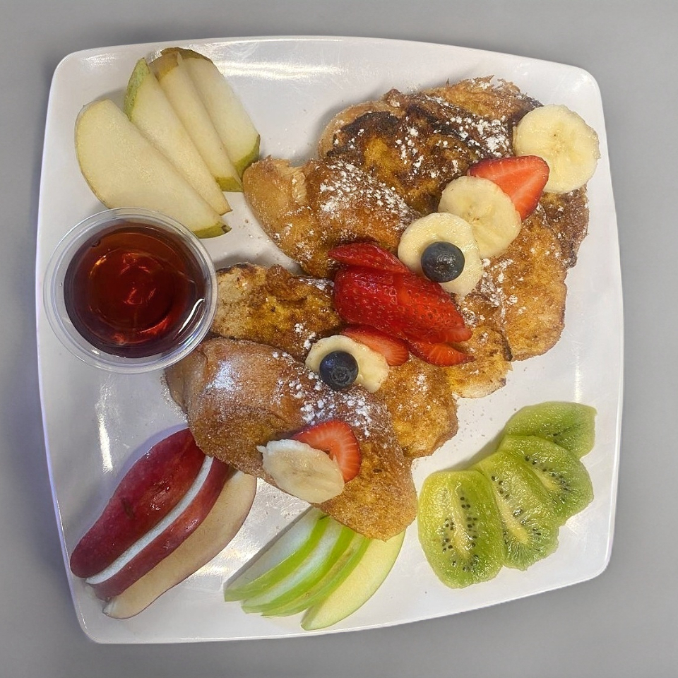 Rebanadas de pan francés dorado, servidas con fruta fresca de temporada y un toque de miel o azúcar glass.