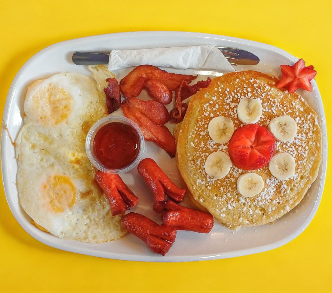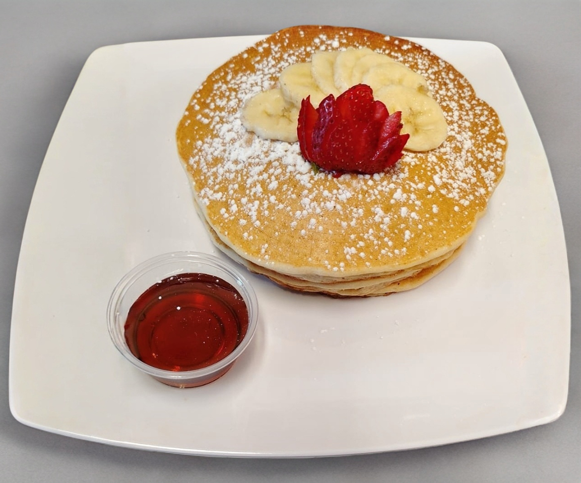 2 Hot cakes, con huevo revuelto al gusto, salchicha, tocino.