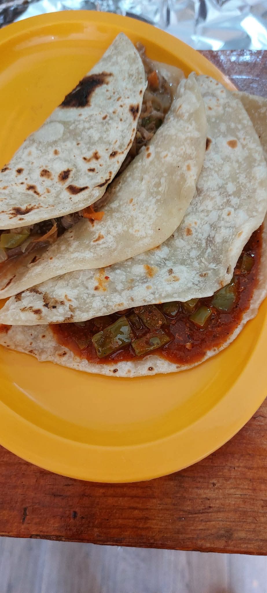 3 Tacos de carne deshebrada acompañados de frijol, ensalada y salsa bandera.