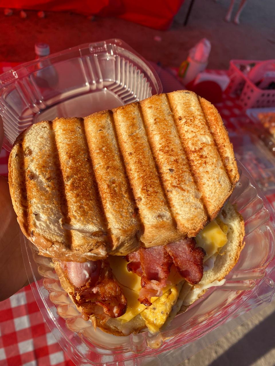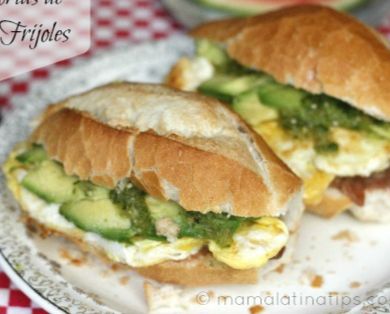 Tocino, huevo, queso americano, espinaca, tomate, cebolla y mayonesa. Servido en pan multigrano integral. Acompañado con chiles jalapeños.
