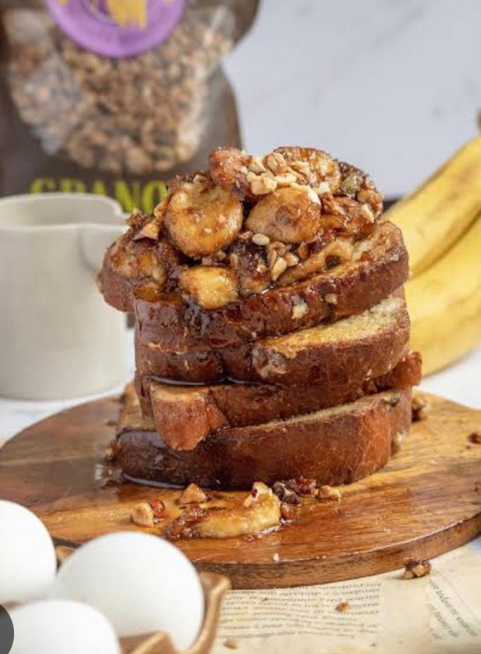 Pan francés con huevo, vainilla, y canela, servido con miel de maple, platano y granola 2pzs