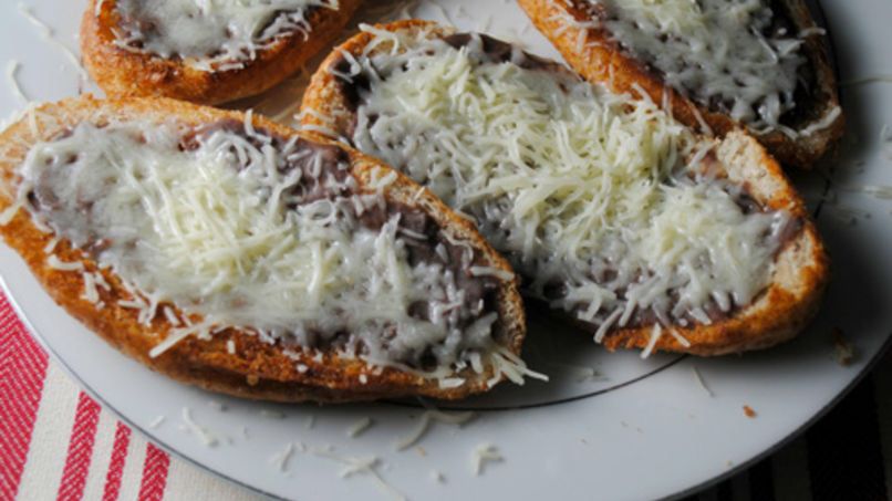 Dos piezas de pan tostado cubierto con frijoles, jamon de pavo y queso gratinado acompañado con chiles jalapeños.