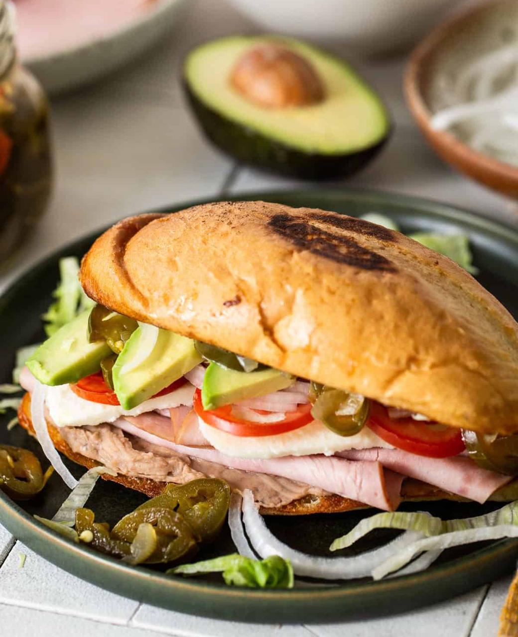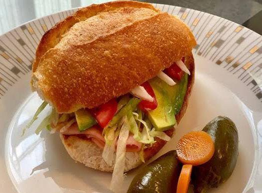 Una torta caliente de jamón, queso americano, tomate, cebolla, lechuga y aguacate acompañada de chiles jalapeños.