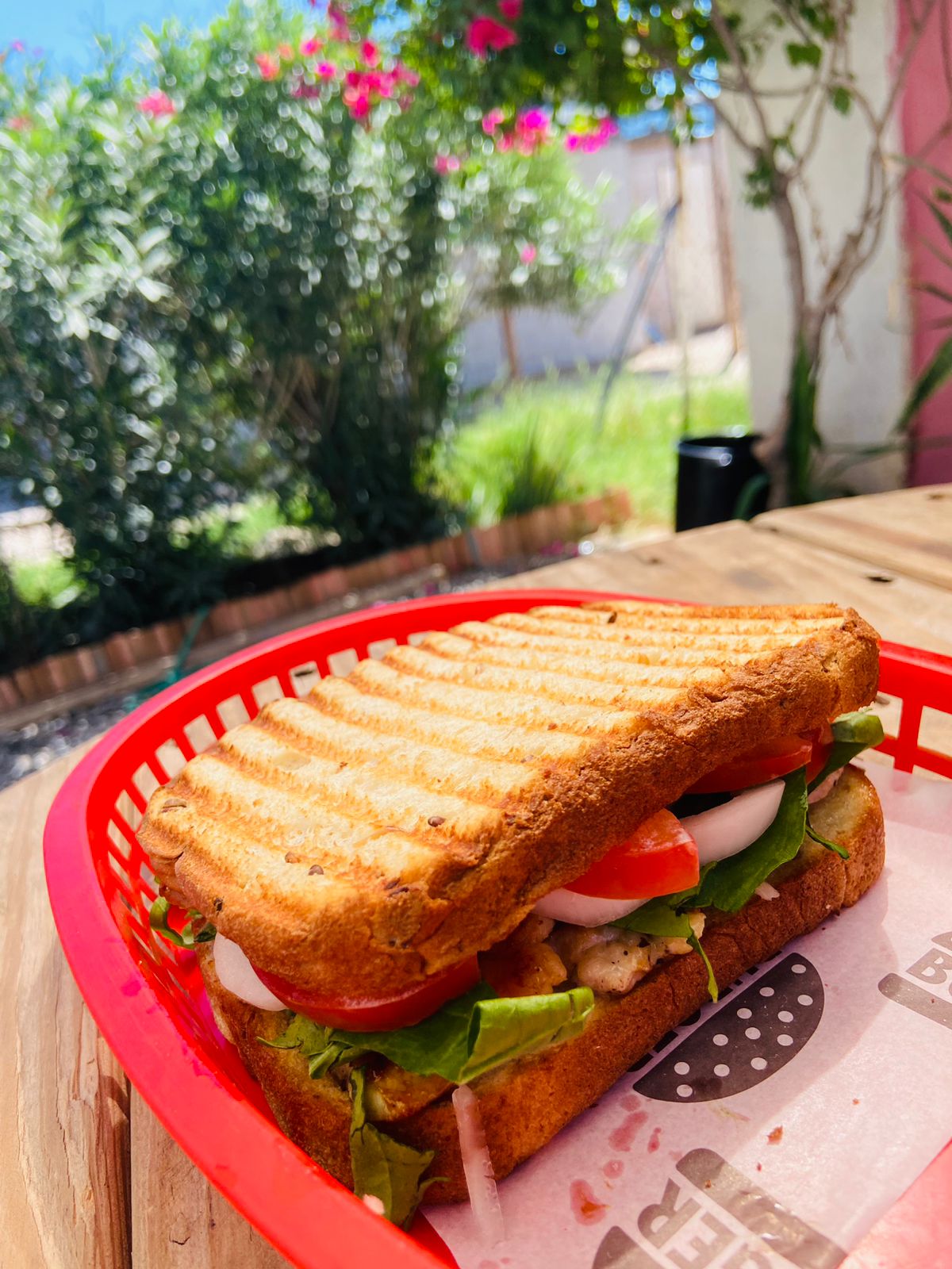 Carne asada con espinaca, tomate, cebolla, y mayonesa. Servido en pan multigrano integral. Acompañado de chiles jalapeños.