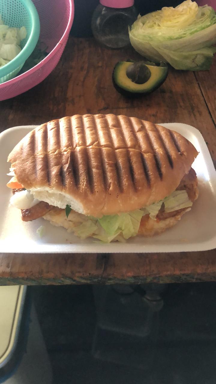 Una torta con pechuga de pollo , tomate, cebolla, lechuga, aguacate acompañada de chiles jalapeños.