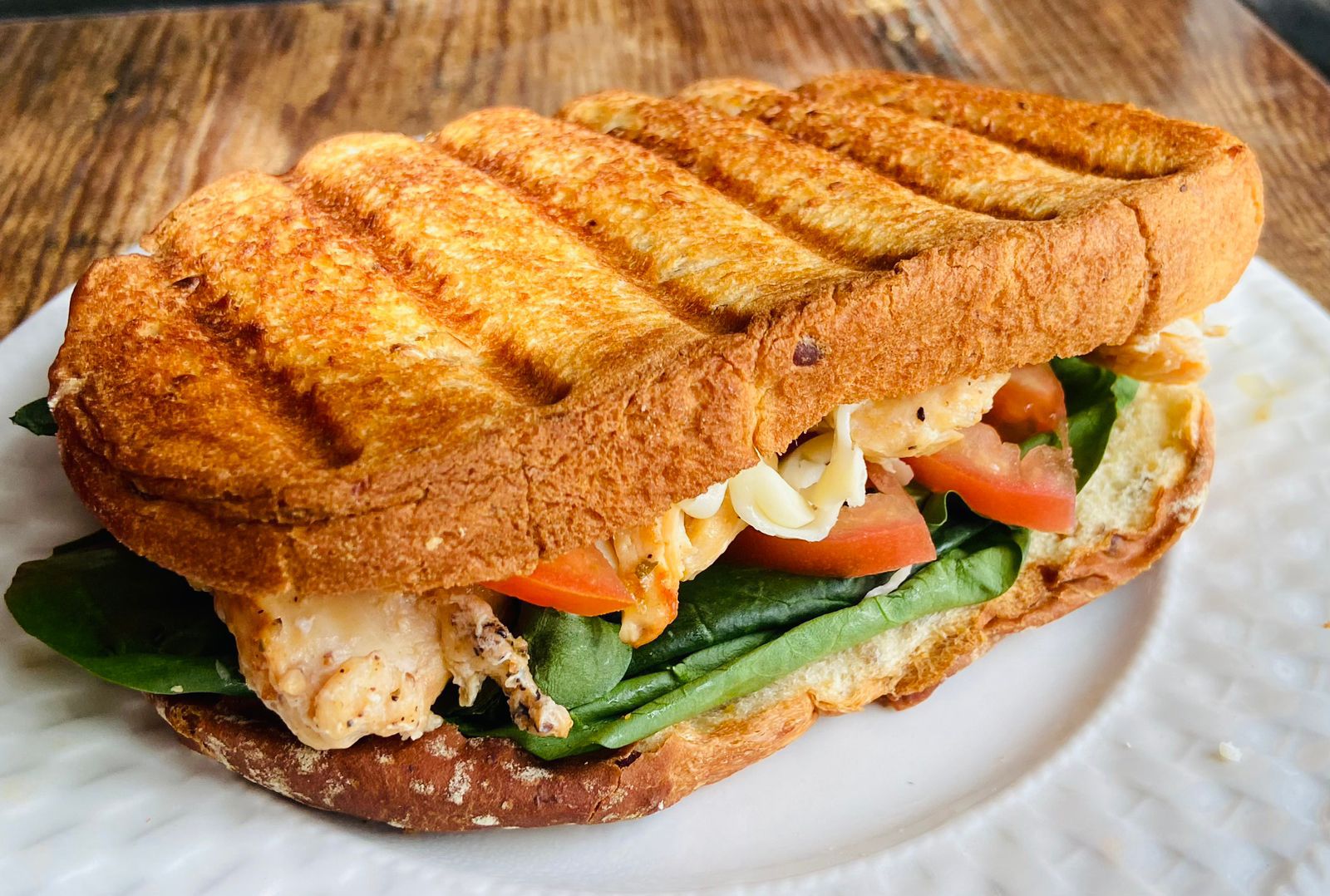 Pechuga de pollo con queso monterrey, espinaca, tomate, cebolla y mayonesa. Servido en pan multigran acompañado de chiles jalapeños.o integral.