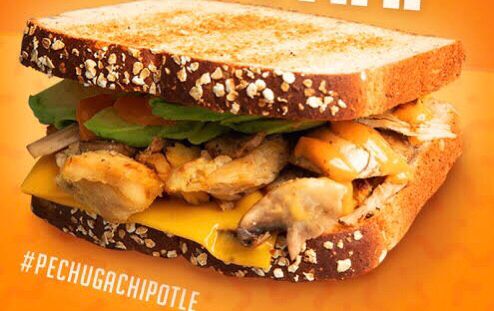 Pechuga de pollo en salsa chipotle con queso monterrey, espinaca, tomate, cebolla, y mayonesa. Servido en pan multigrano integral. Acompañado de chiles jalapeños.