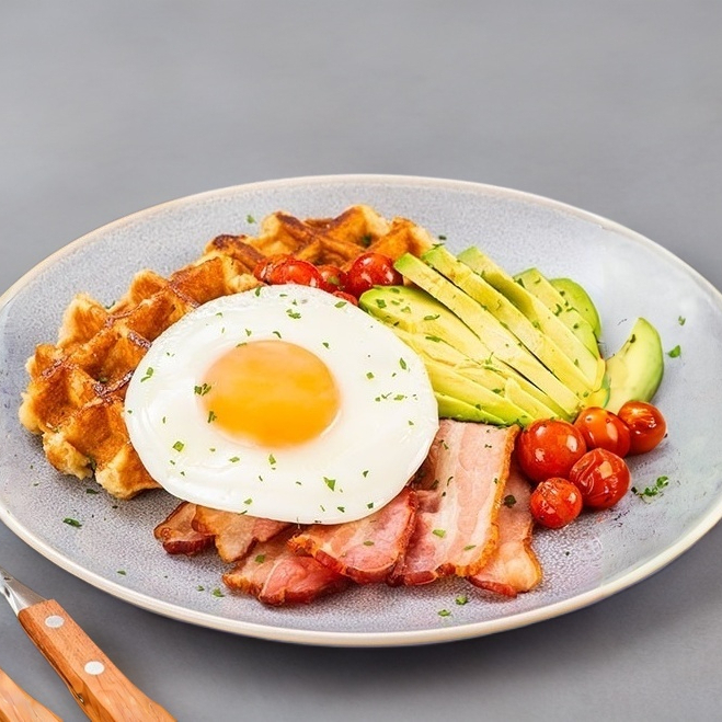 Waffles con 2 huevos estrellado, tocino, mantequilla y miel