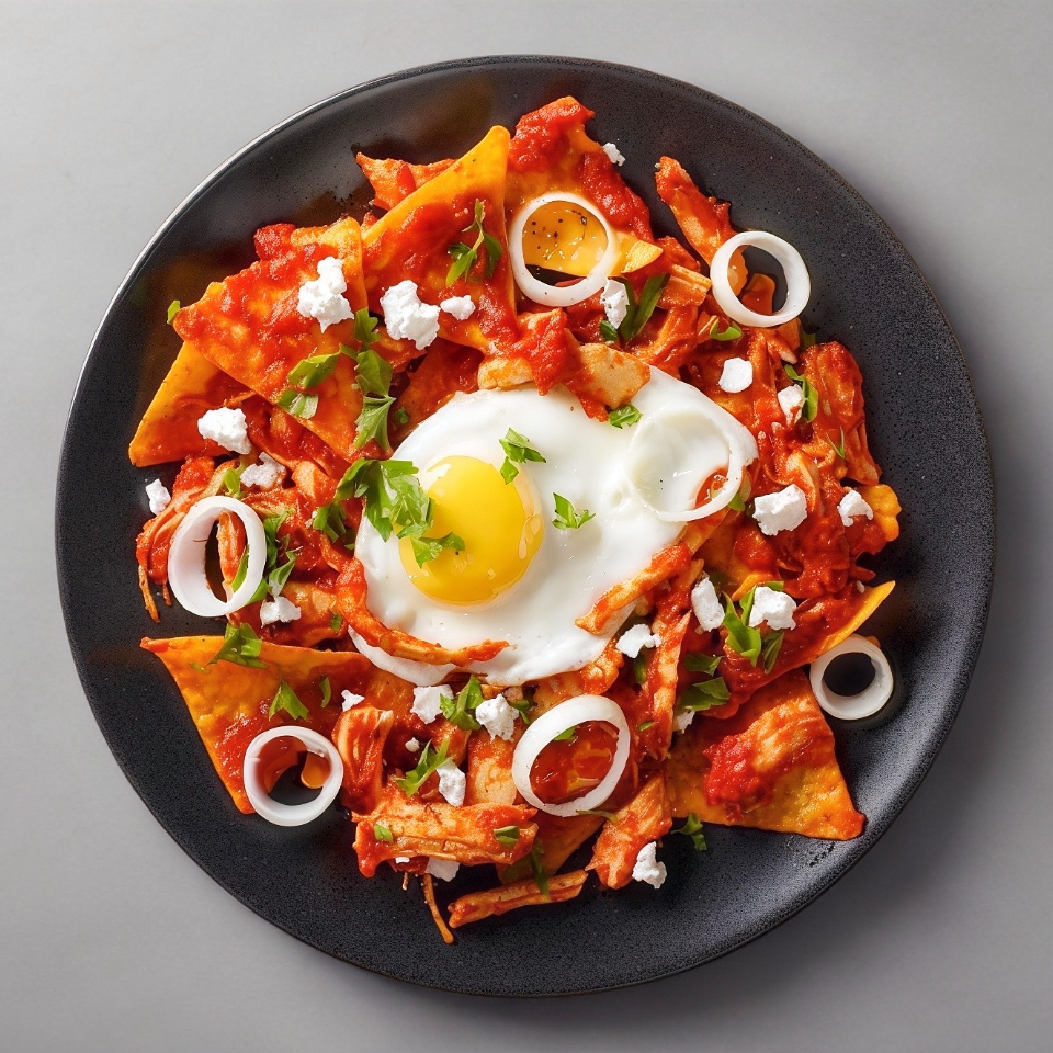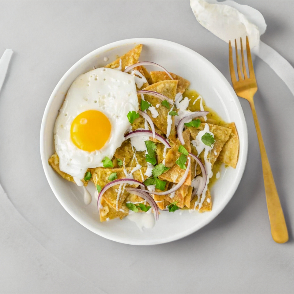 Chilaquiles con pechuga de pollo, cebolla, cilantro, crema, queso, huevo, frijoles