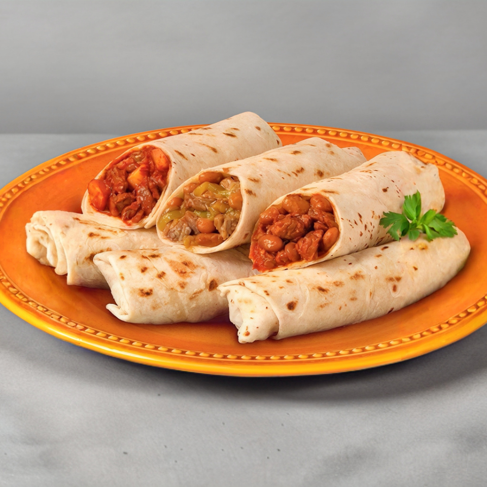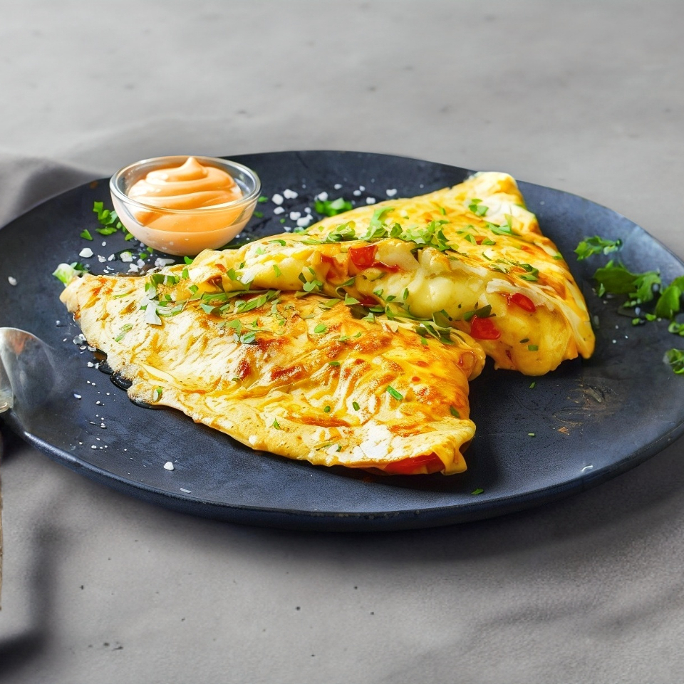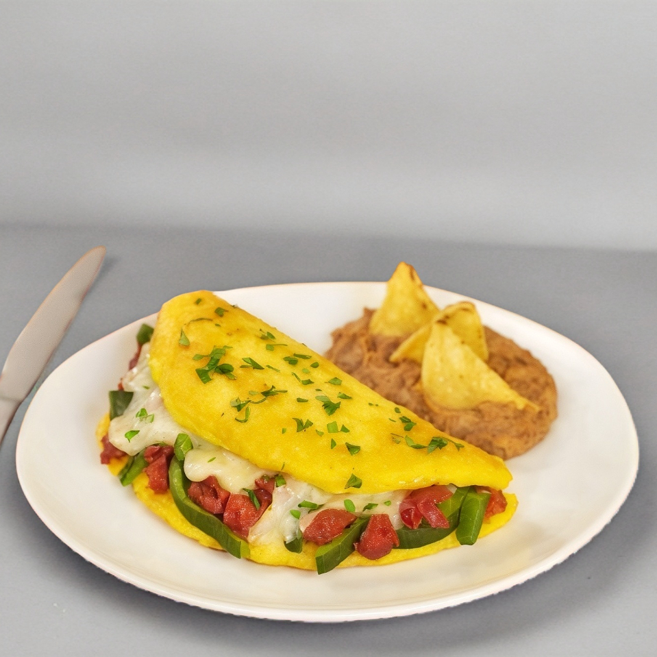 Omelette con chorizo, queso, frijoles y tortillas de harina o maíz.
