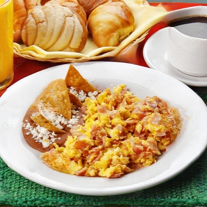 Huevo Revuelto con jamón, frijoles y tortillas de harina o maíz