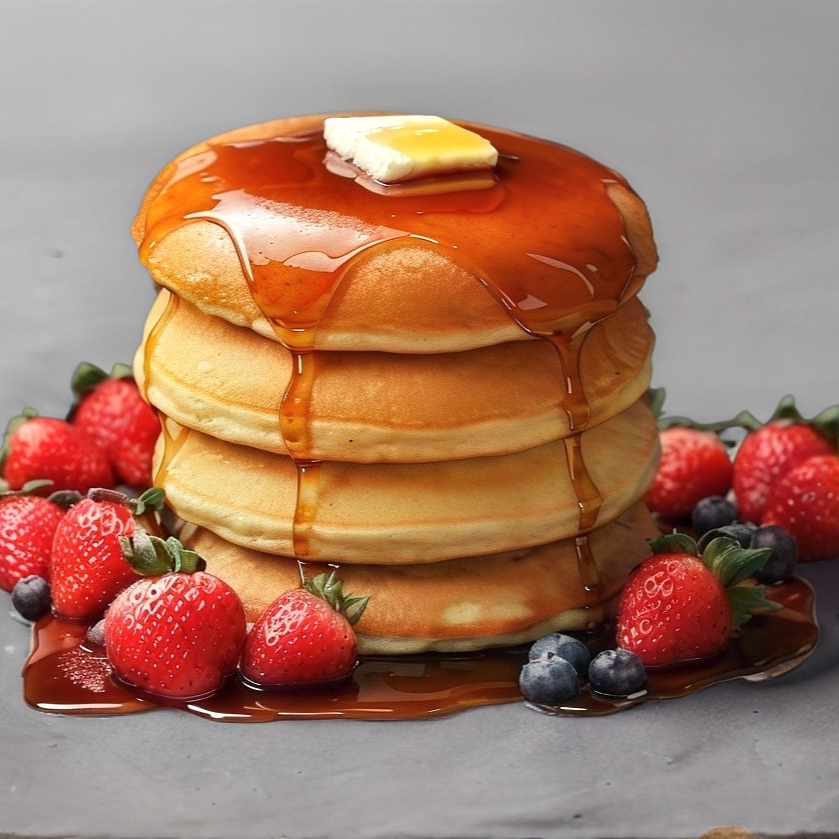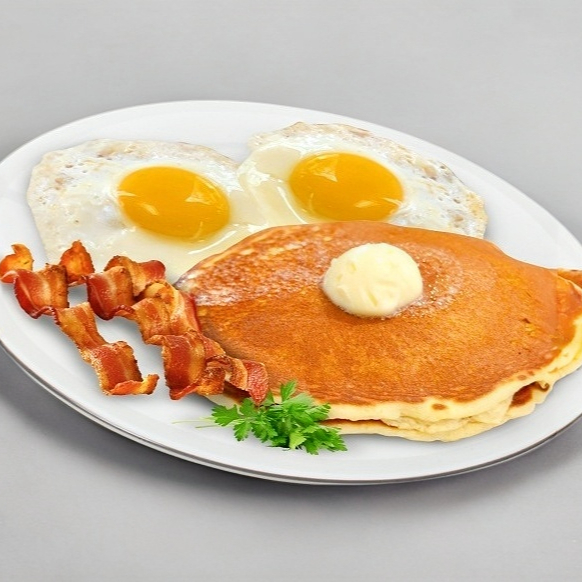 Dos hotcakes, dos huevos estrellados o revueltos y tocino