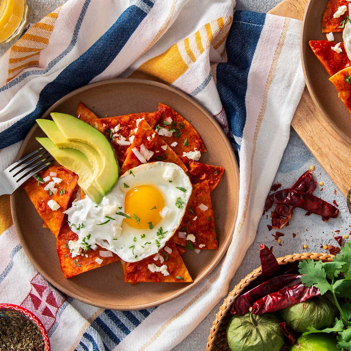 Los Chilaquiles, crema, cebolla, cilantro con un huevo, frijol