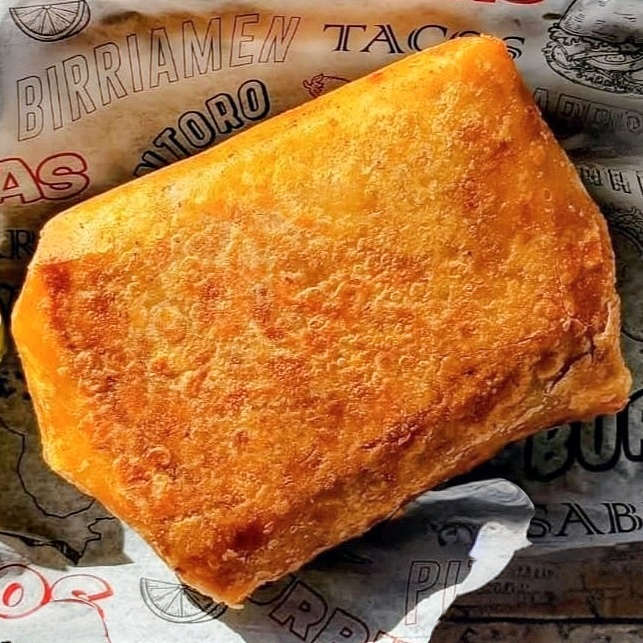 Rico pan blanco relleno de birria especial DON TORO y costra de queso.