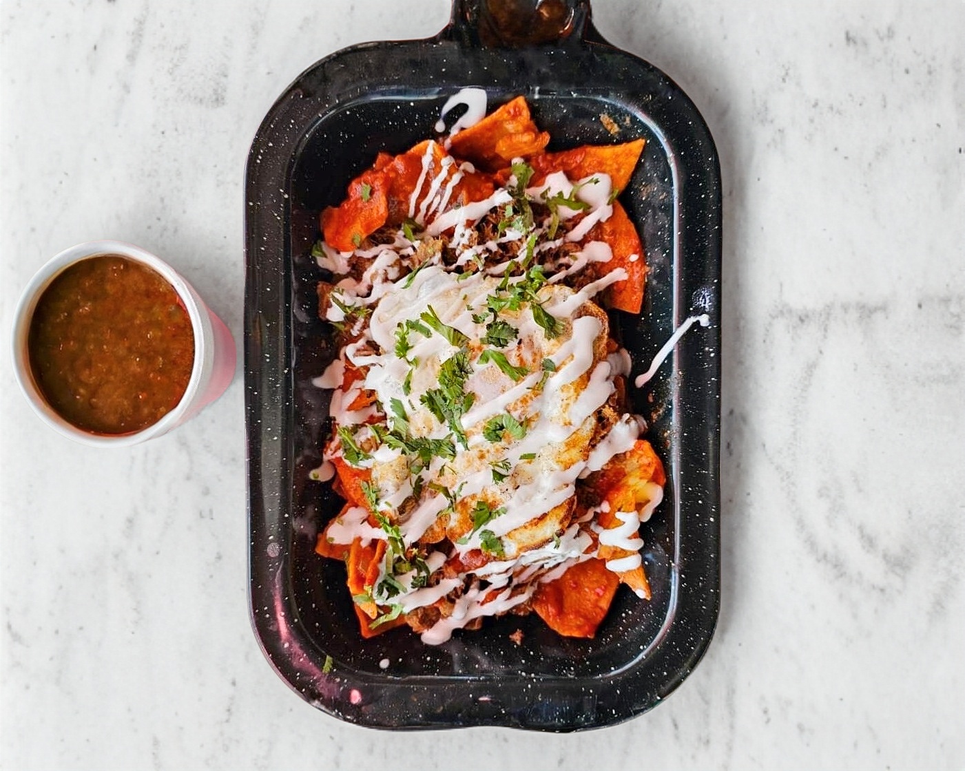 Crujientes totopos de maiz bañados en salsa picosita roja,carne de birria un huevo estrellado. Aparte se agrega: cilantro,cebolla y crema