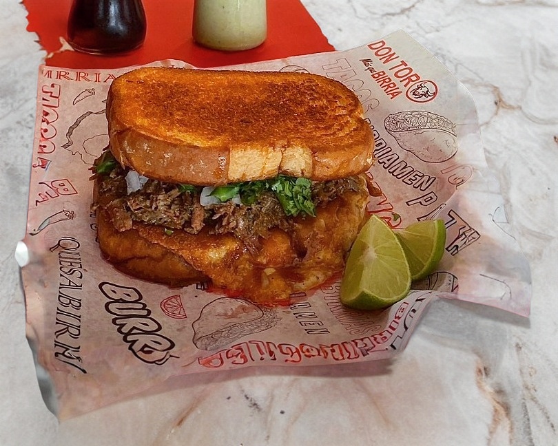 Delicioso bolillo relleno de frijolitos, costra de queso y birria especial DON TORO.