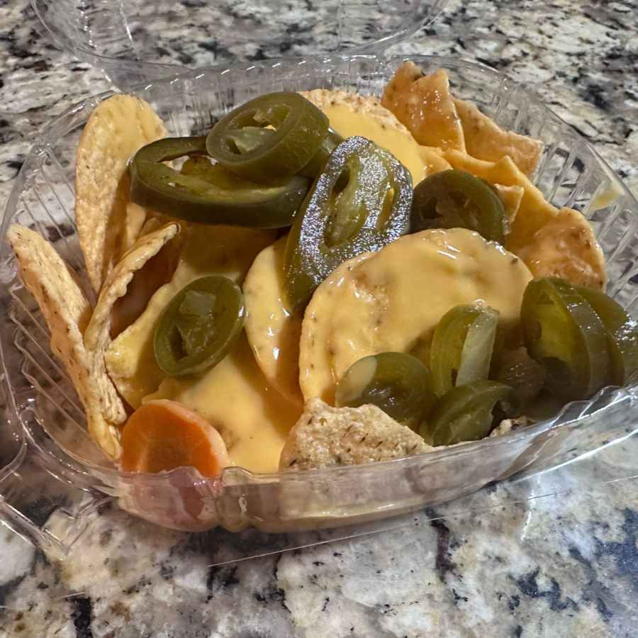 Nachos crujientes con queso amarillo derretido y jalapeños.