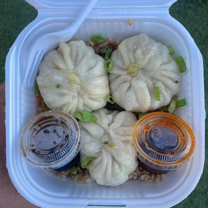 Dumplings rellenos de carne molida de cerdo y repollo, acompañados de una cama de arroz yakimeshi. Incluye cebollin, salsa soya y salsa macha.