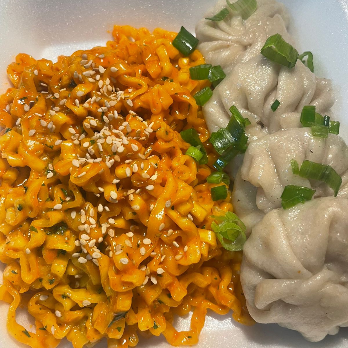 Dumplings rellenos de carne molida de cerdo con repollo, acompañados de sopa buldak carbonara. Incluyen cebollin, ajonjoli, salsa soya y salsa macha