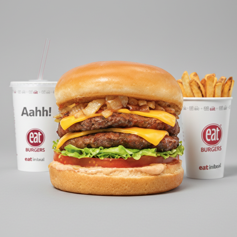 Hamburguesa con doble carne, doble queso, aros de cebolla con crujiente empanizado spicy, mayonesa y salsa BBQ