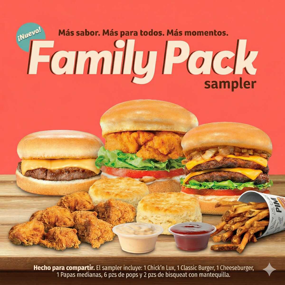 Hecho para compartir. Incluye: 1 Chick’n Lux, 1 Classic Burger, 1 Cheeseburger, 1 Papas medianas, 6 pzs de pops y 2 psz de bisqueat con mantequilla.