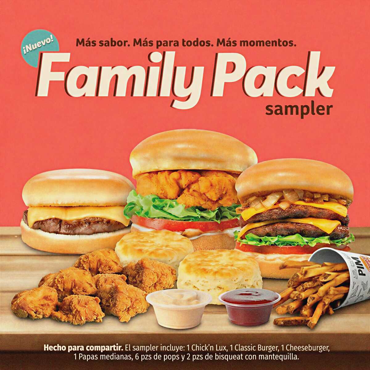 Hecho para compartir. Incluye: 1 Chick’n Lux, 1 Classic Burger, 1 Cheeseburger, 1 Papas medianas, 6 pzs de pops y 2 psz de bisqueat con mantequilla.