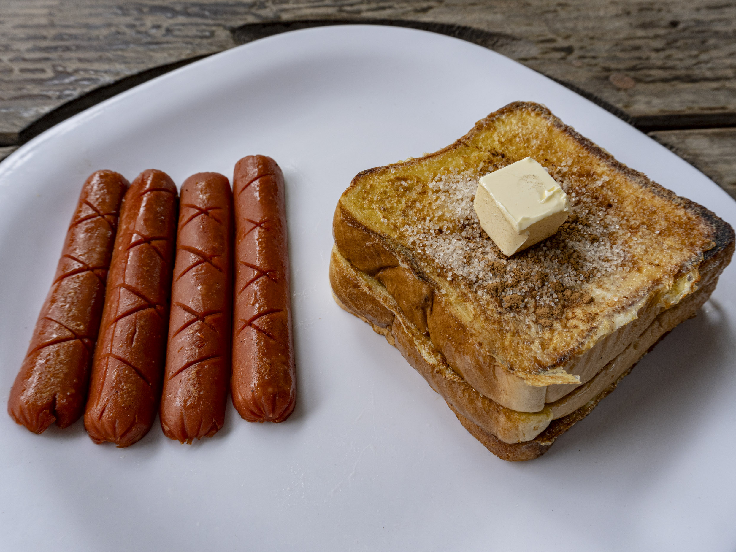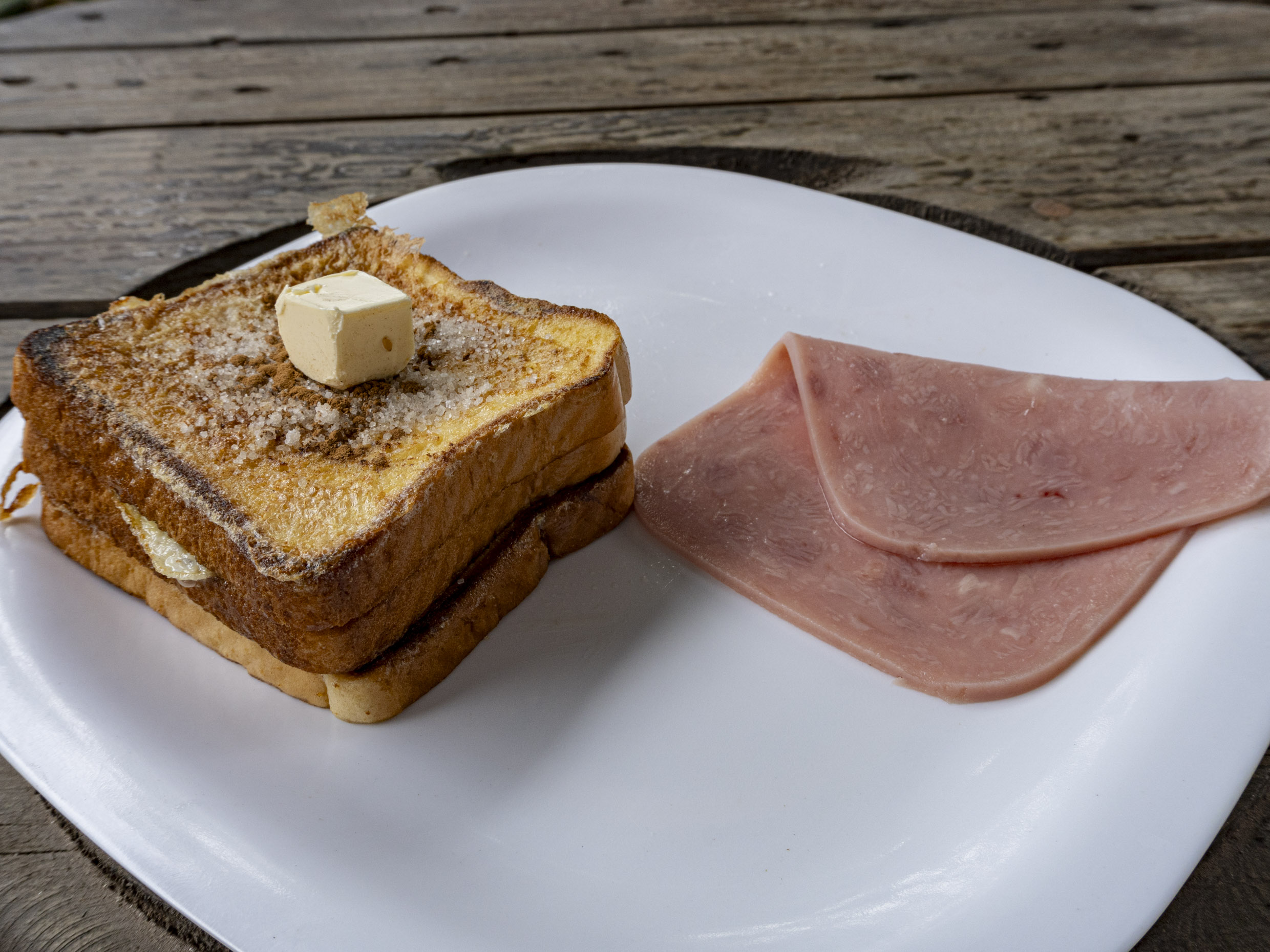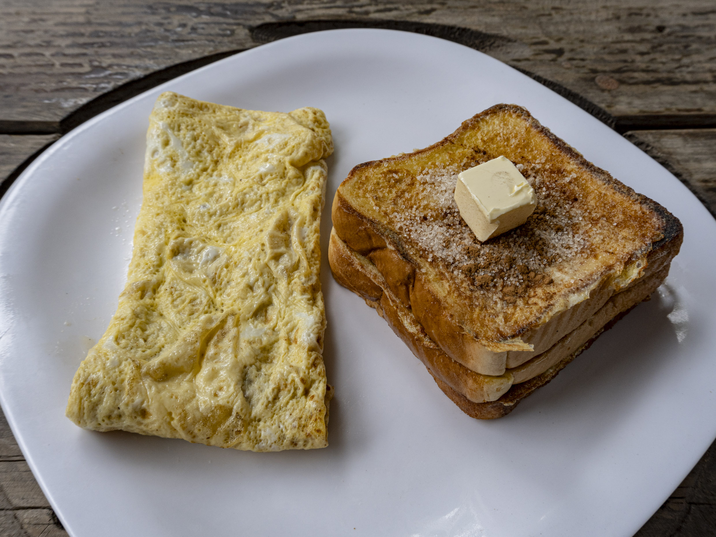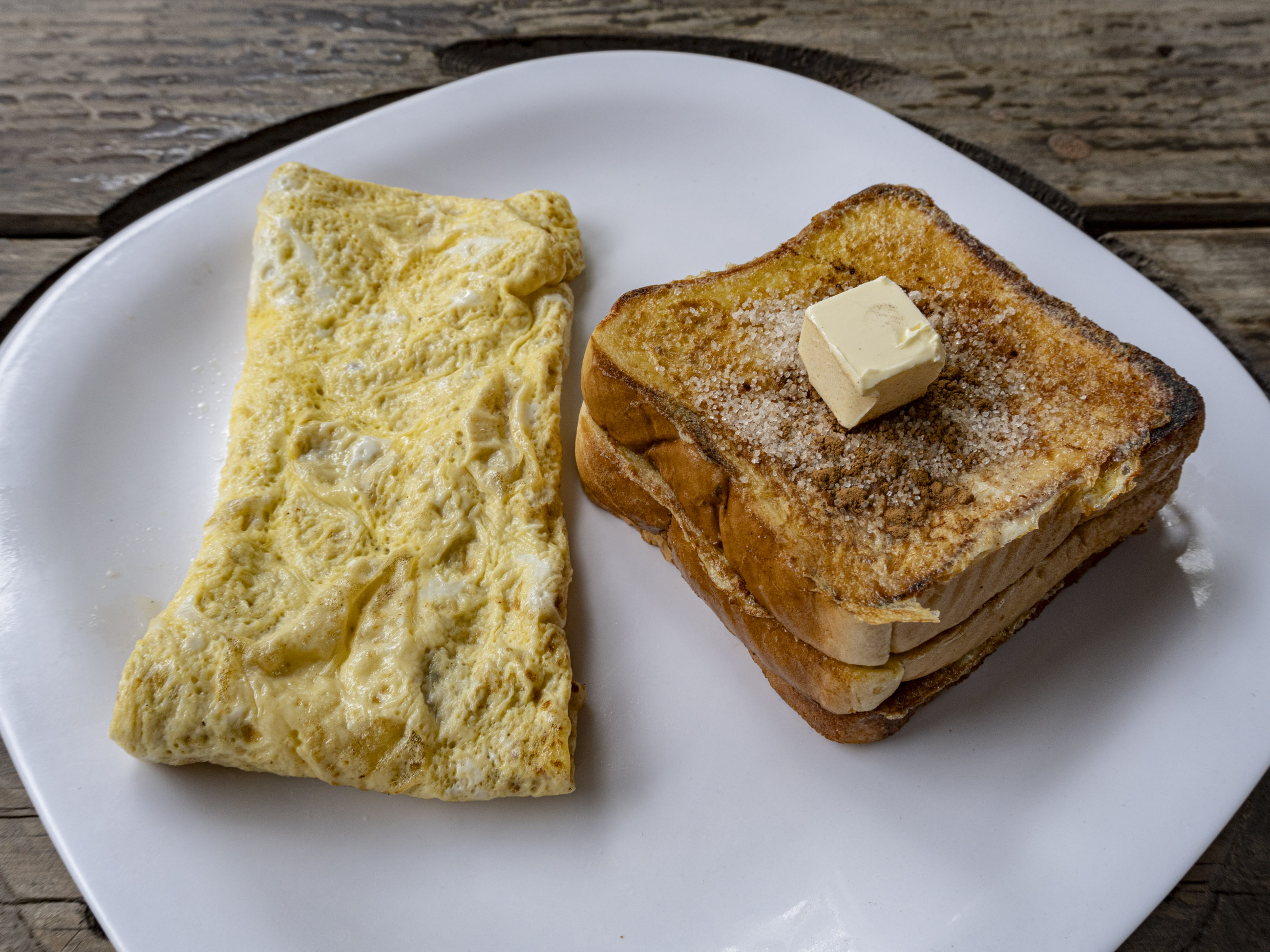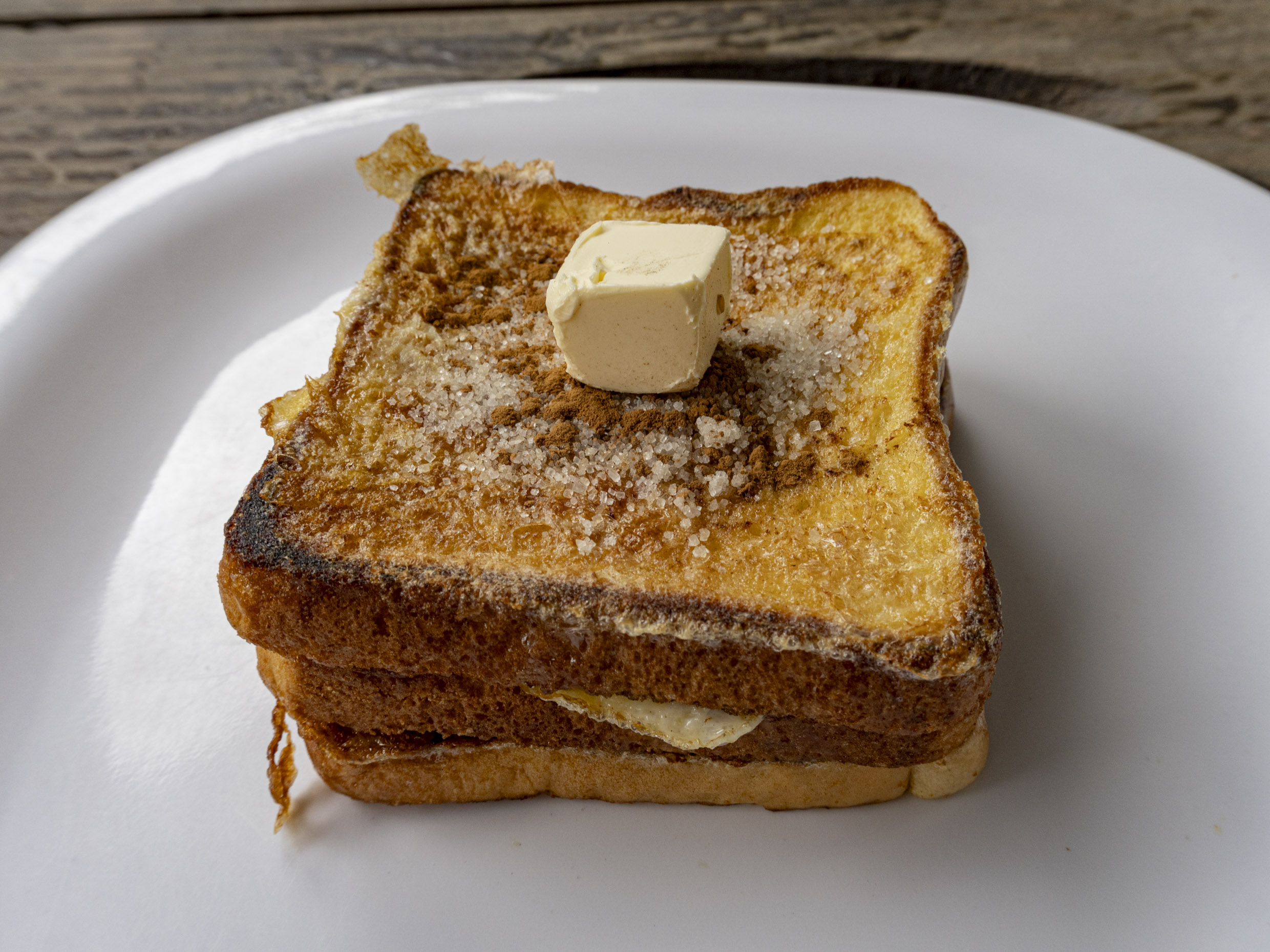 Pan capeado con huevo acompañando de mantequilla y miel de Maple