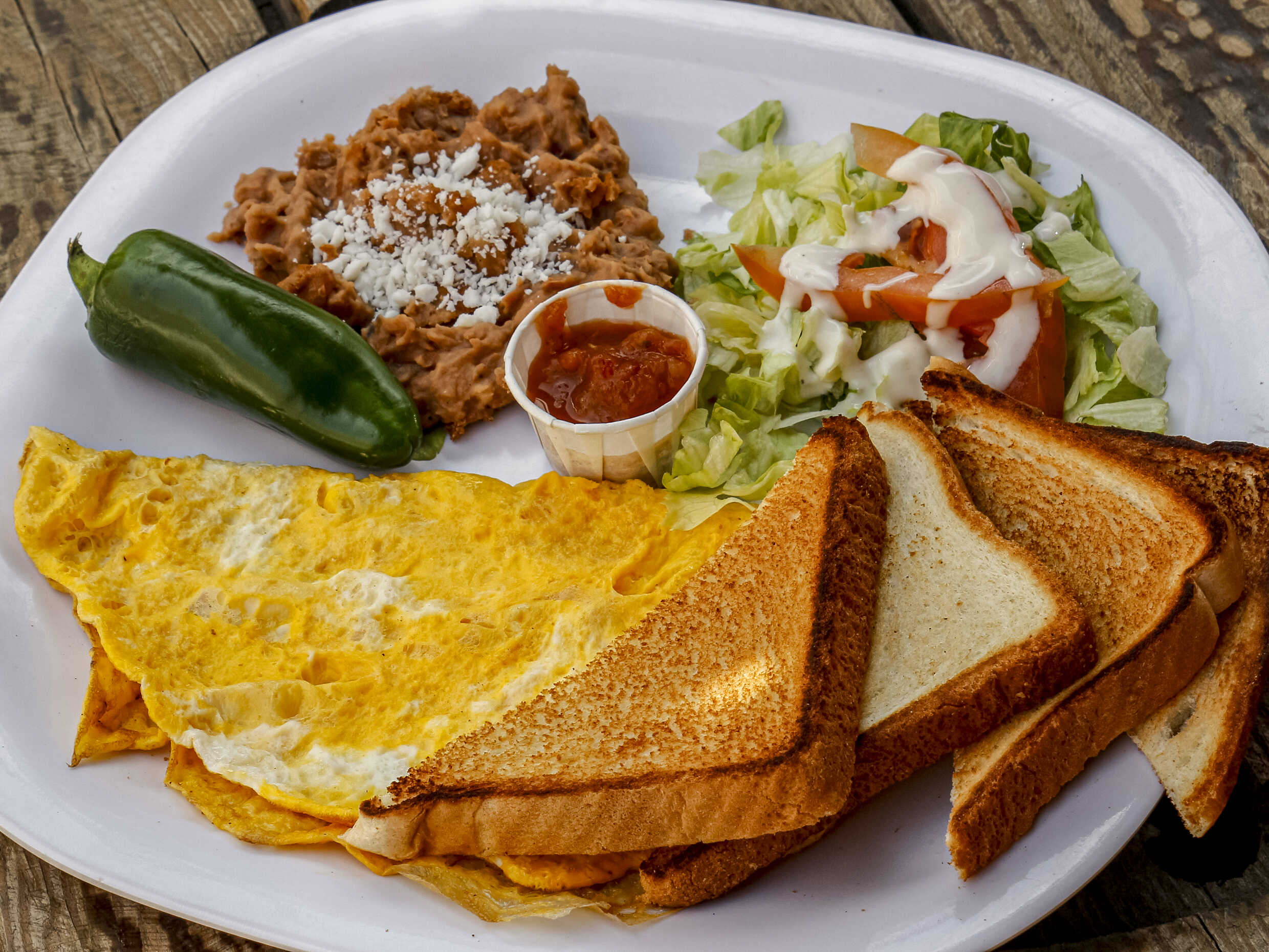 Omelette con queso monterrey jack, acompañado de frijol refrito,ensalada y