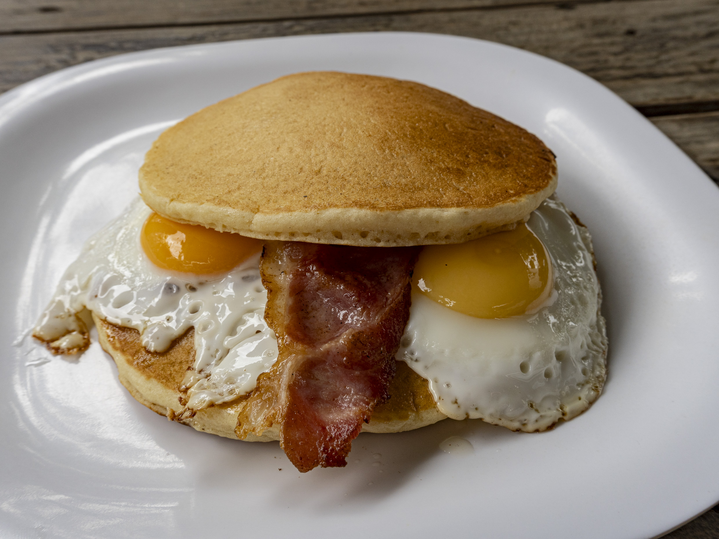 Tocino doradito 2 huevos estrellados en Medio de 2 hotcakes con mantequilla y miel de Maple