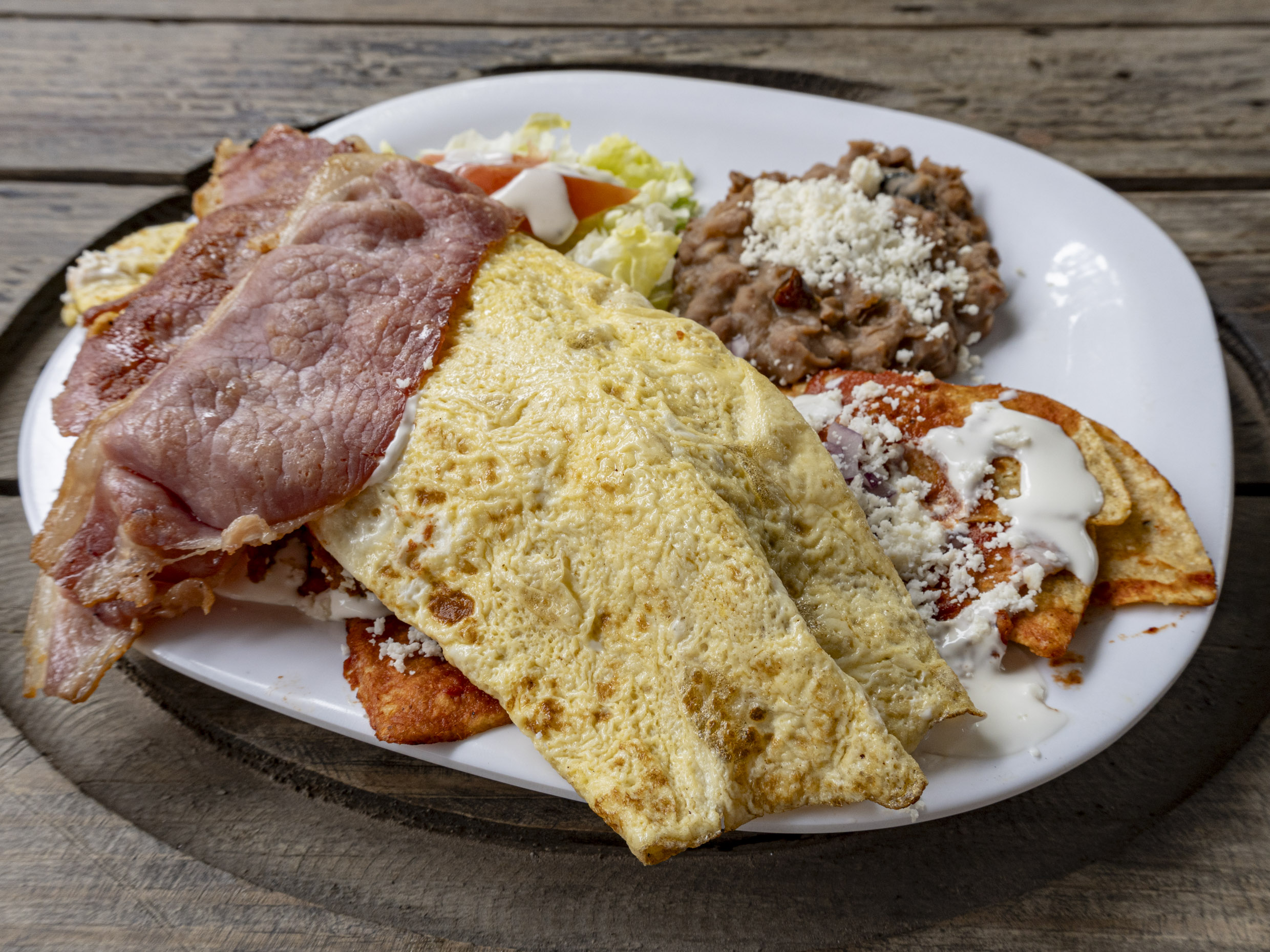 Omelette con queso monterrey jack y tocino doradito, acompañado de frijol refrito,ensalada